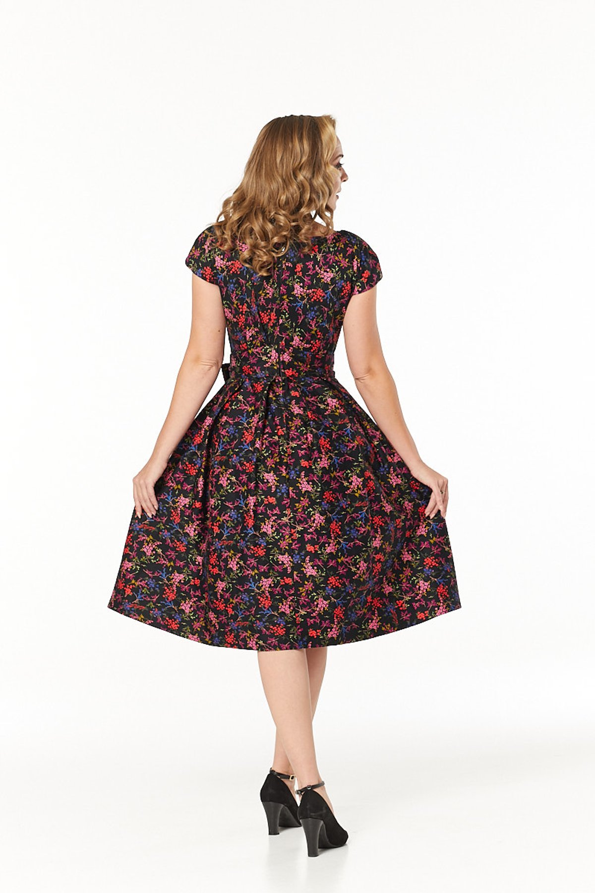Keep it playful with a retro headband and some dainty jewelry—perhaps a hint of pink to match the florals. For footwear, opt for kitten heels or cute ballet flats to keep the look effortlessly charming. If you’re feeling bold, a splash of red lipstick and a vintage clutch will elevate your style to feline fabulous levels.