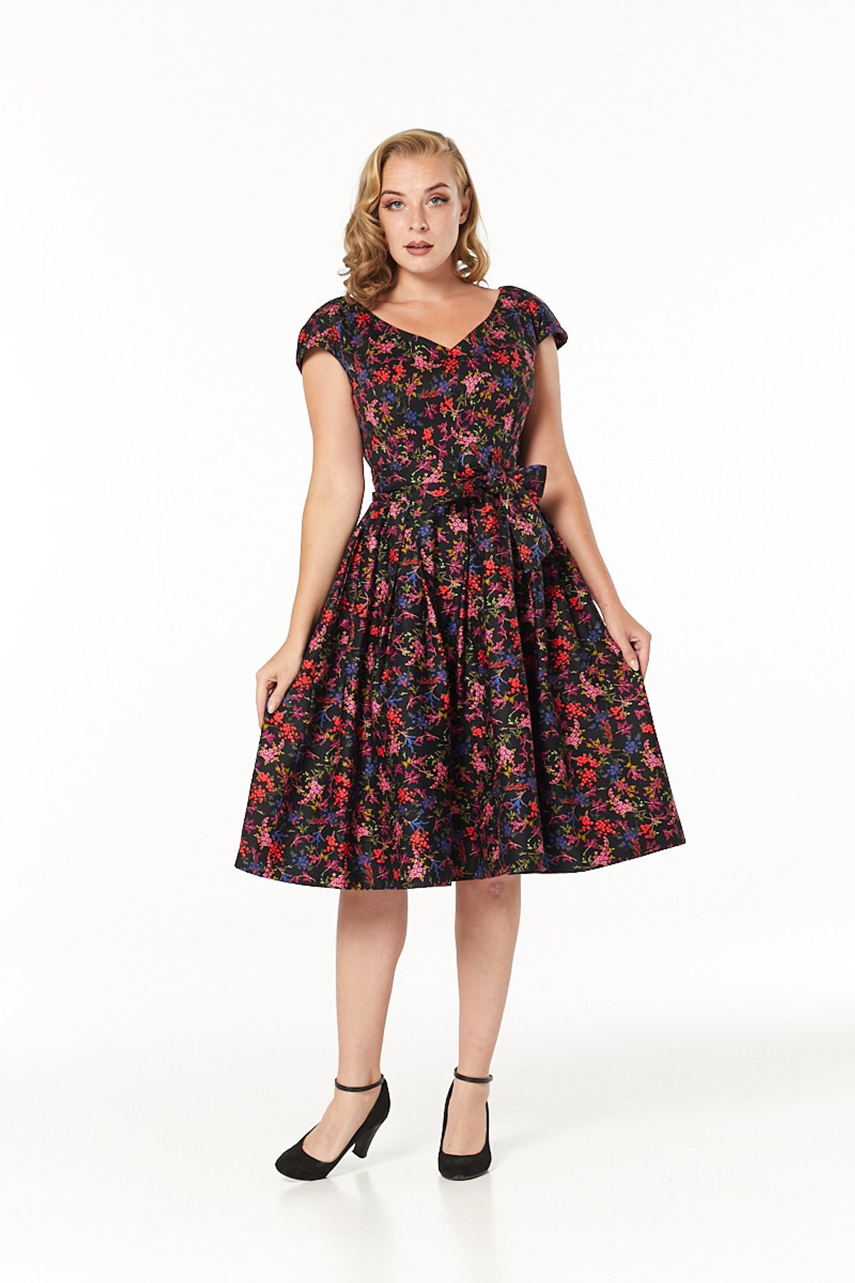 Unleash your inner vintage vixen with the Nova Dress—a purrfect blend of retro charm and modern allure. Its lively floral pattern in black and pink is a visual delight, while the swing silhouette and cap sleeves add a touch of playful sophistication. The V-neckline offers just the right hint of décolletage, and the fixed tie straps at the waist ensure a snug, flattering fit that’s as comfortable as it is chic. Crafted from a soft yet sturdy cotton blend, this dress swings and sways with your every move, making every moment feel like a scene from a bygone era, yet utterly fresh.