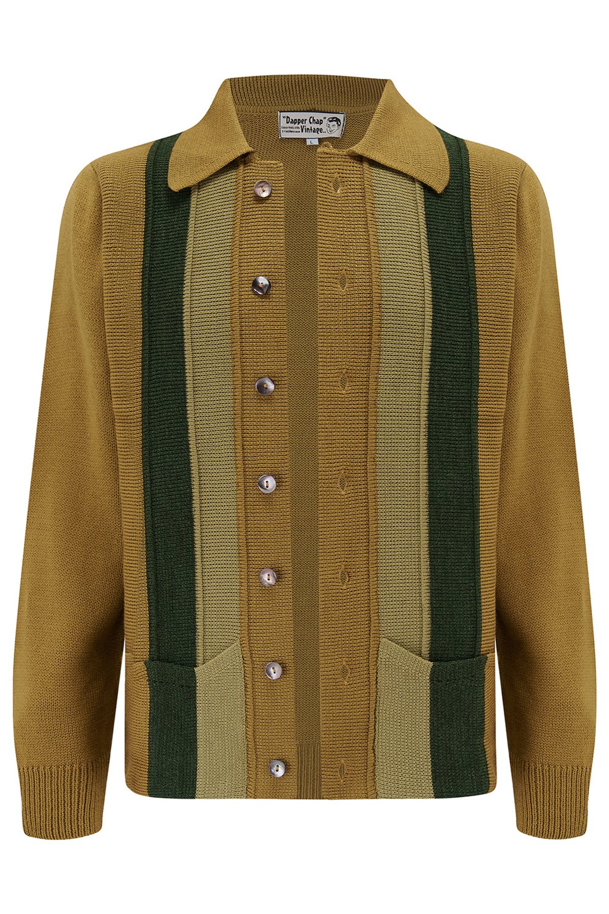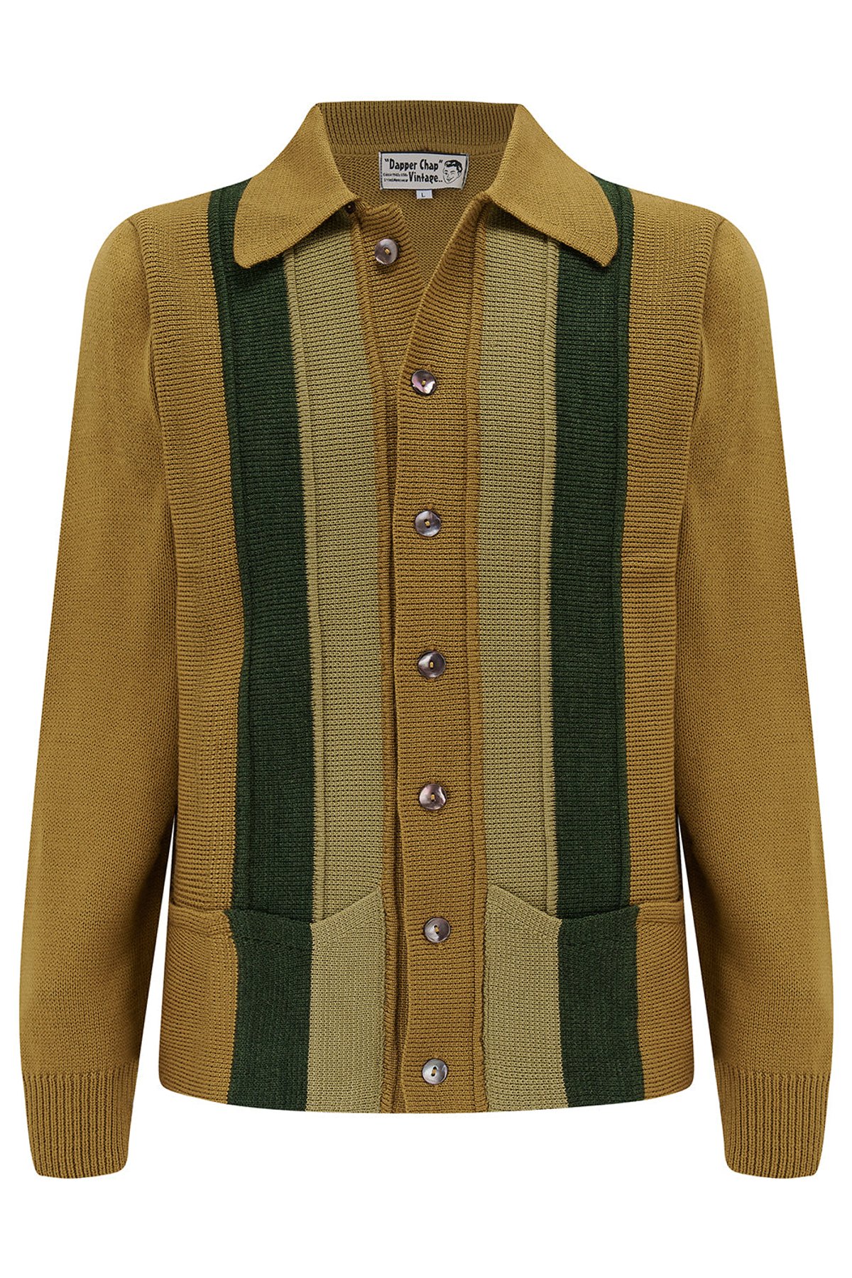 Step into timeless charm with our Arthur men's button-front knitted shirt cardigan, a purrfect blend of vintage flair and modern edge. The rich olive hue with dark green accents and sleek vertical stripes make it a truly claws-down gorgeous choice. Its classic turn-down collar and cozy knit set the stage for effortless style, while handy hip pockets add practicality to its dapper appeal. Designed to flatter, whether you’re layering over a crisp shirt or rocking it open over your favorite tee, this cardigan will have you feeling sleek and sophisticated with a touch of retro mischief.