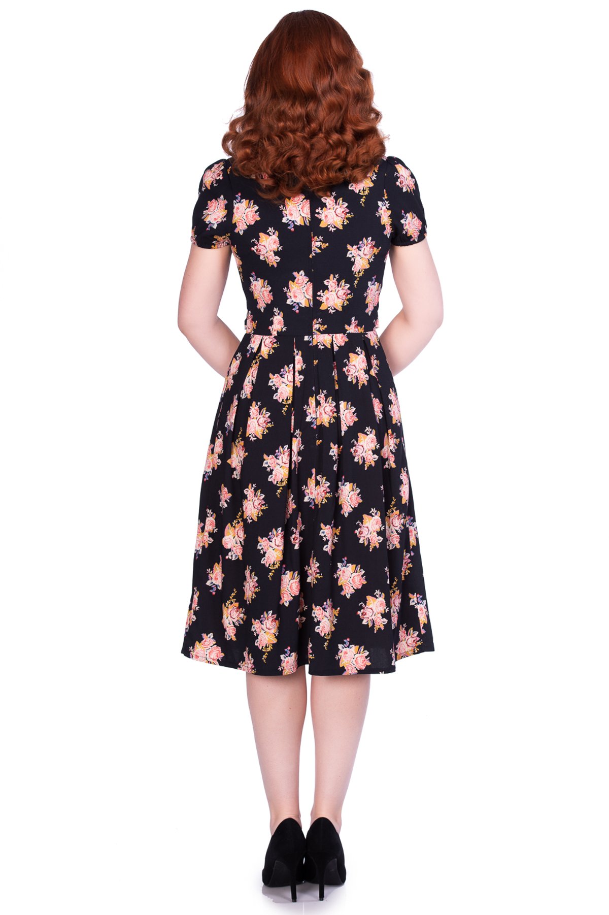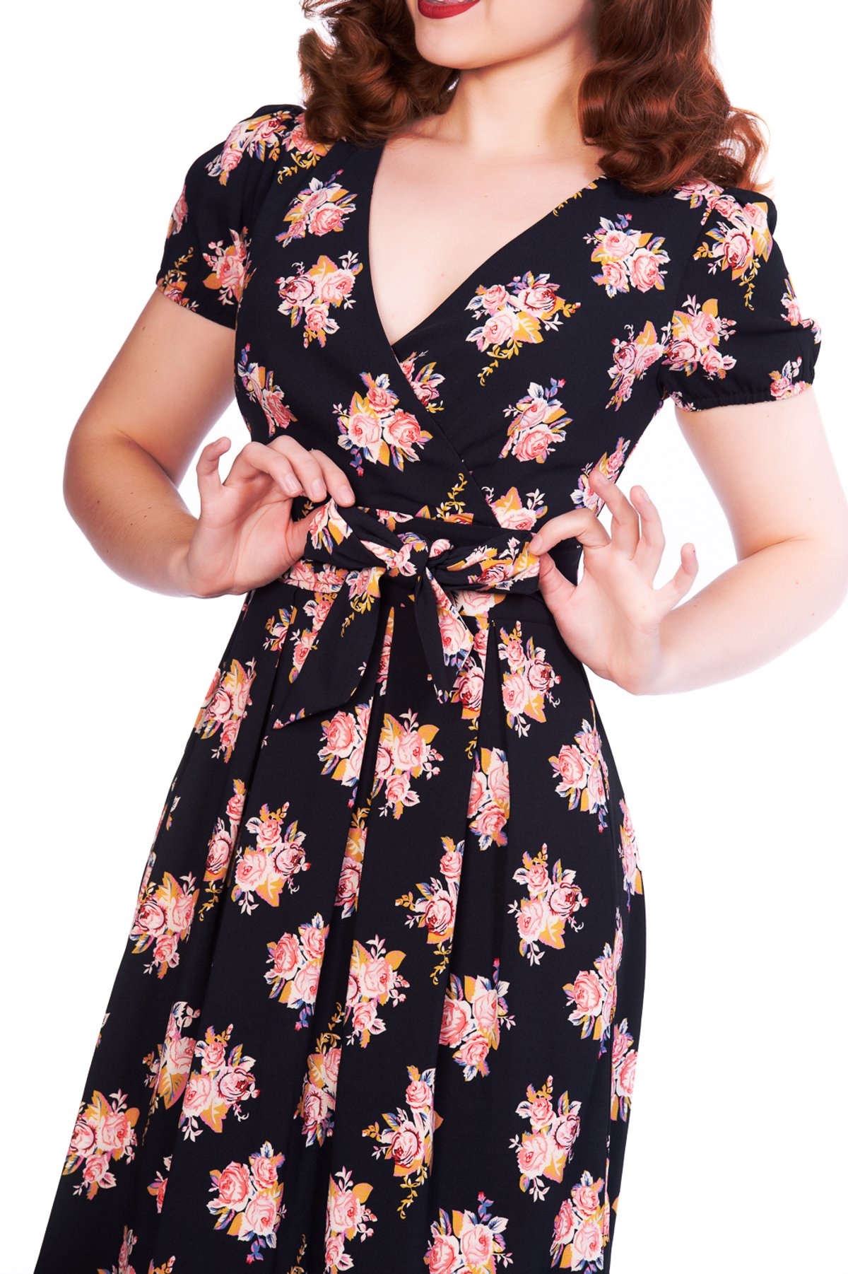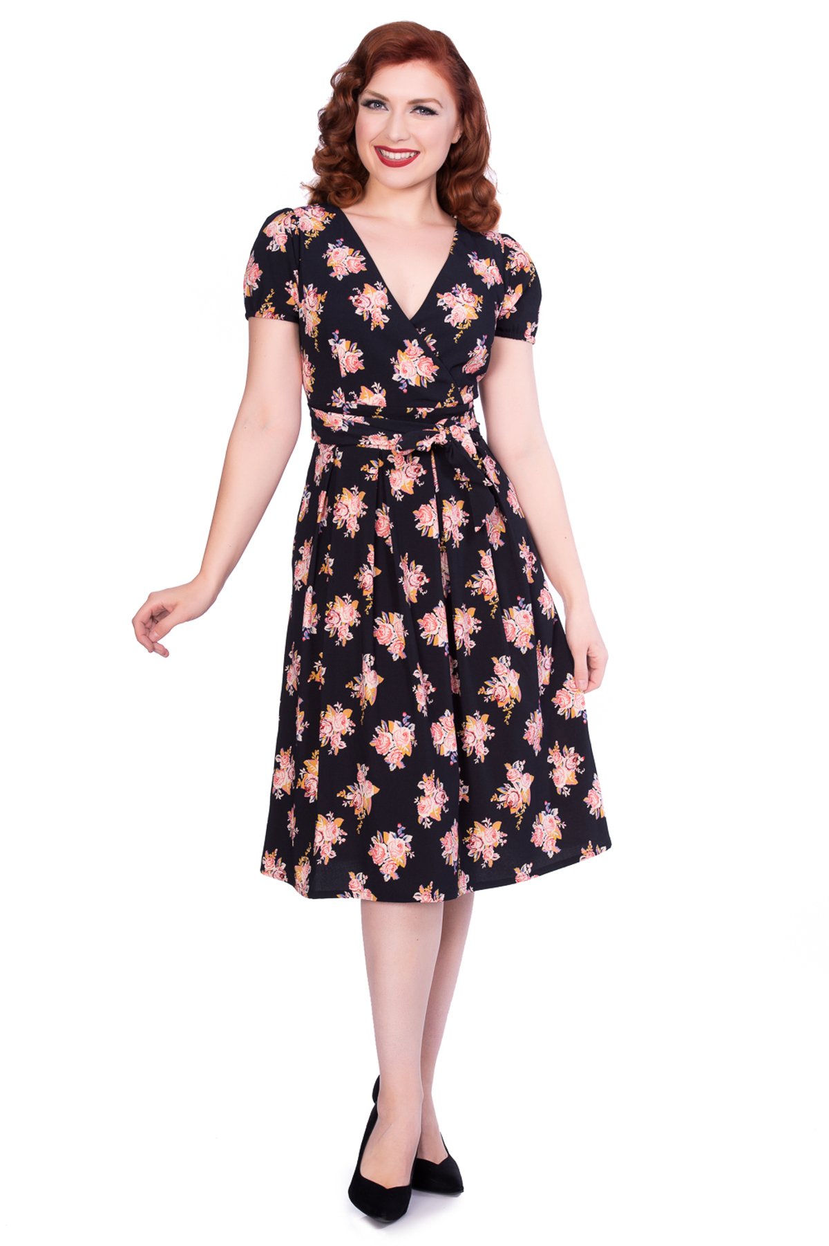 Get ready to purr with delight! The Kaya Dress is your go-to for a look that’s both sultry and sweet, boasting a vintage-inspired silhouette with a playful twist. The black and pink floral print adds a burst of timeless charm, while the wrap top and pleated details give it that claws-down gorgeous edge. The semi-swing skirt invites a little twirl, making every moment feel just a little more fabulous. Crafted from a luxurious stretch fabric, this dress moves with you—because comfort and style should always go paw in paw. Whether you're catching up with friends or slipping into something special for a date night, this dress is a surefire way to turn heads and land compliments.