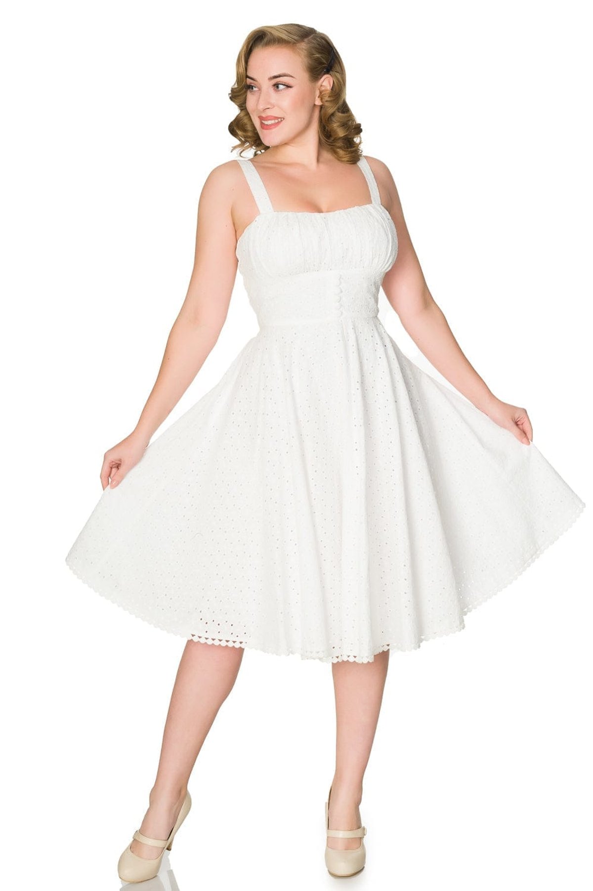 Step into the spotlight with the Valerie White Dress—where vintage allure meets modern charm. The delicate eyelet fabric, combined with the gathered bust and effortlessly flared skirt, makes this piece a true showstopper. Its timeless white hue exudes a fresh, purrfectly polished vibe, while the fit-and-flare silhouette flatters every figure—whether you're feeling playful or poised. Designed to turn heads and bring a touch of retro glamour to your wardrobe, this dress is a delightful way to channel that classic 50s elegance with a contemporary twist. Soft, stylish, and irresistibly charming, it’s ready to be your new go-to for those sunny days or relaxed evenings.