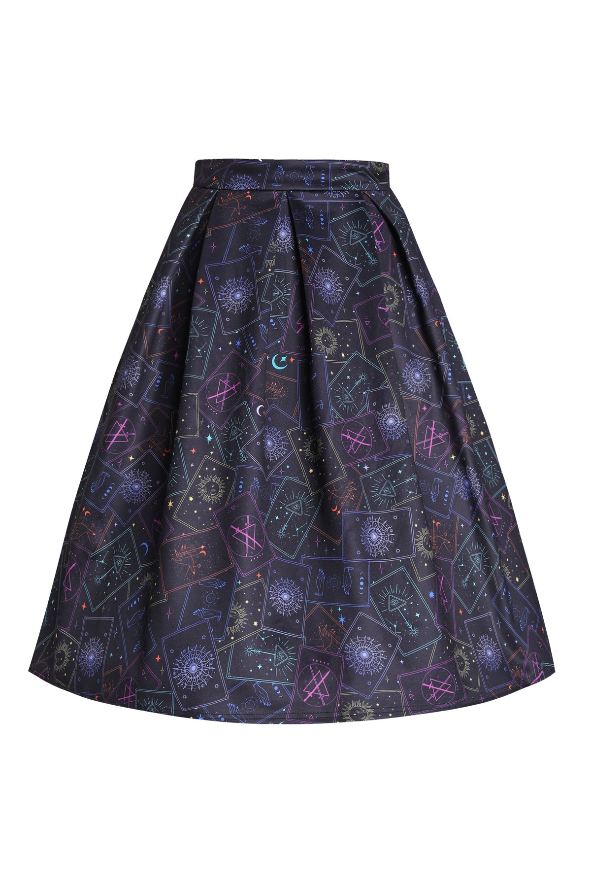 Unleash your inner mystic and turn heads with our Aisley Black Neon Tarot Card Pleated Midi Skirt — a harmonious dance of vintage allure and playful neon flair. With striking tarot card motifs featuring whimsical women and their feline companions, this piece is a purrfect way to add a dash of enchantment to your wardrobe. The sharp, structured pleats lend a touch of sophistication, while the high waist and neon accents keep things lively and fun. Crafted for comfort and style, it’s a versatile choice that'll make your outfit stand out, whether you're out for a casual brunch or a night of daring adventures.