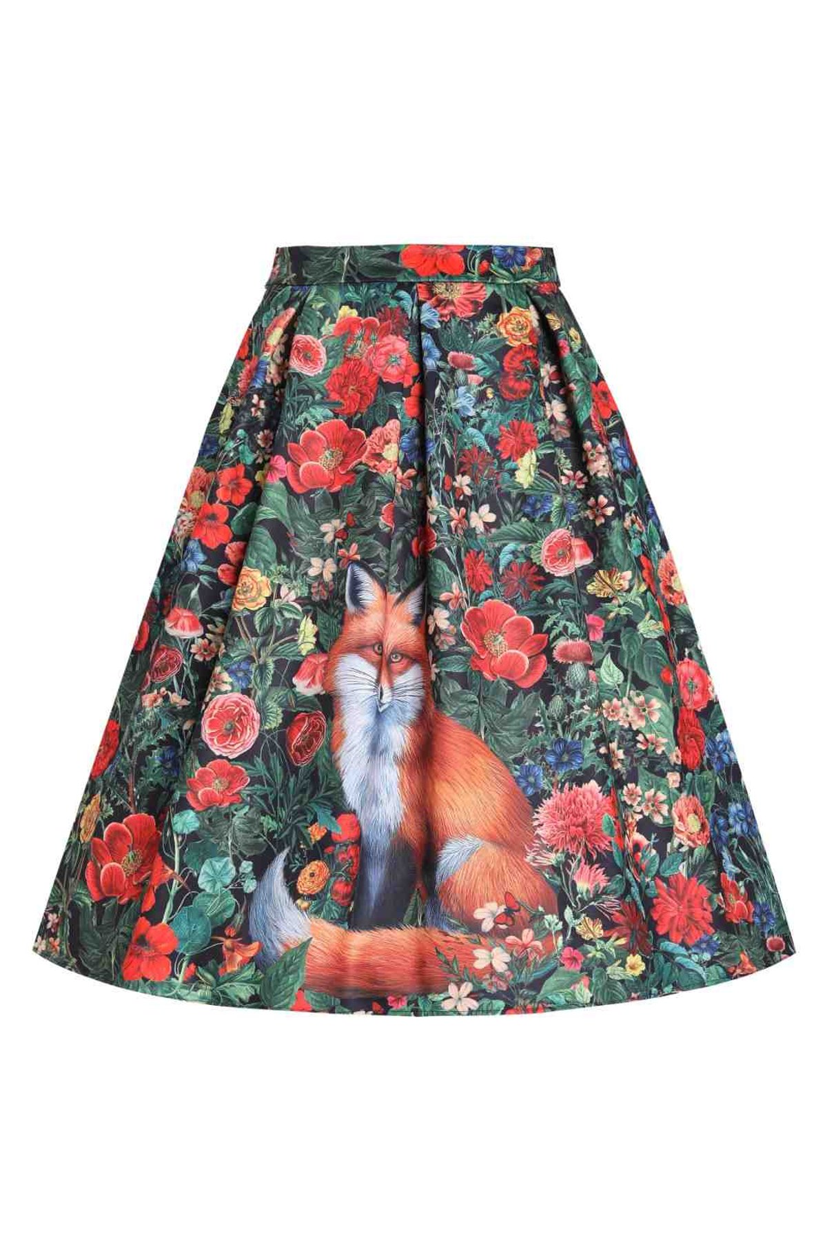 Unleash your inner woodland nymph with the Aisley Floral Forest & Fox Pleated Midi Skirt—where playful foxes frolic among delicate blooms, all wrapped up in a sleek black and lush green palette. The pleats create a mesmerizing movement, making every step feel like a dance through a fairy-tale forest. The high-waisted silhouette offers a flattering, waist-defining fit that’s just as chic as it is comfortable, thanks to a touch of elastane. Designed to turn heads and spark whispers of enchantment, this skirt is a perfect blend of elegance and whimsy—all with a subtle feline flair.