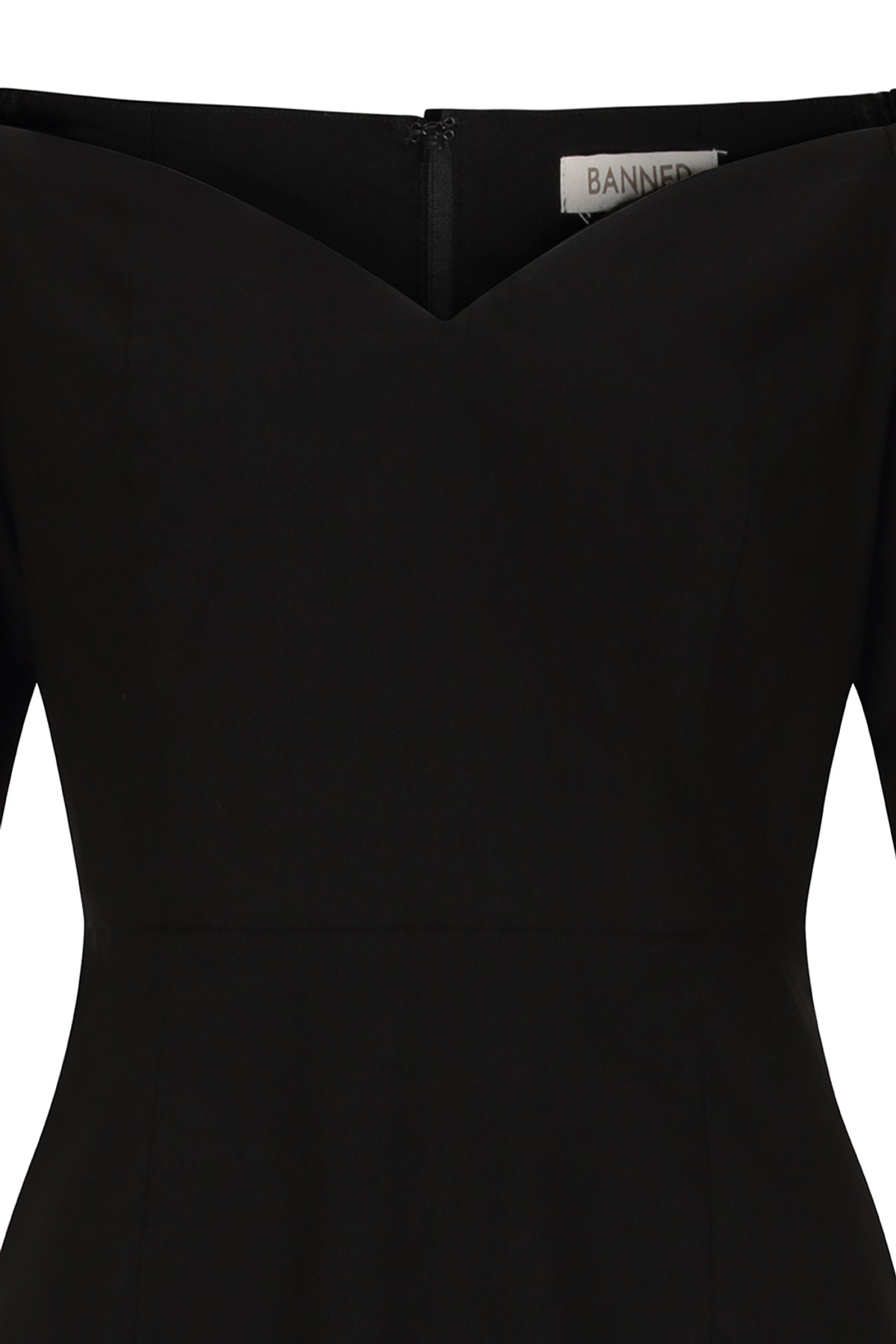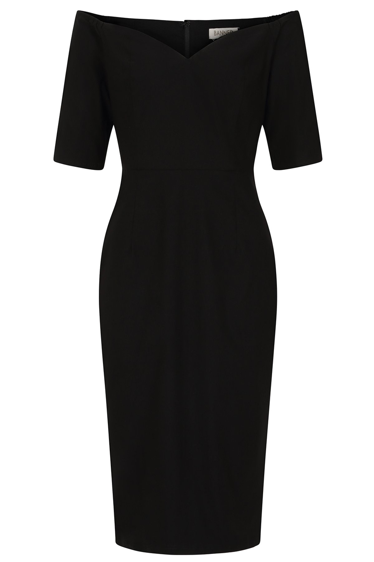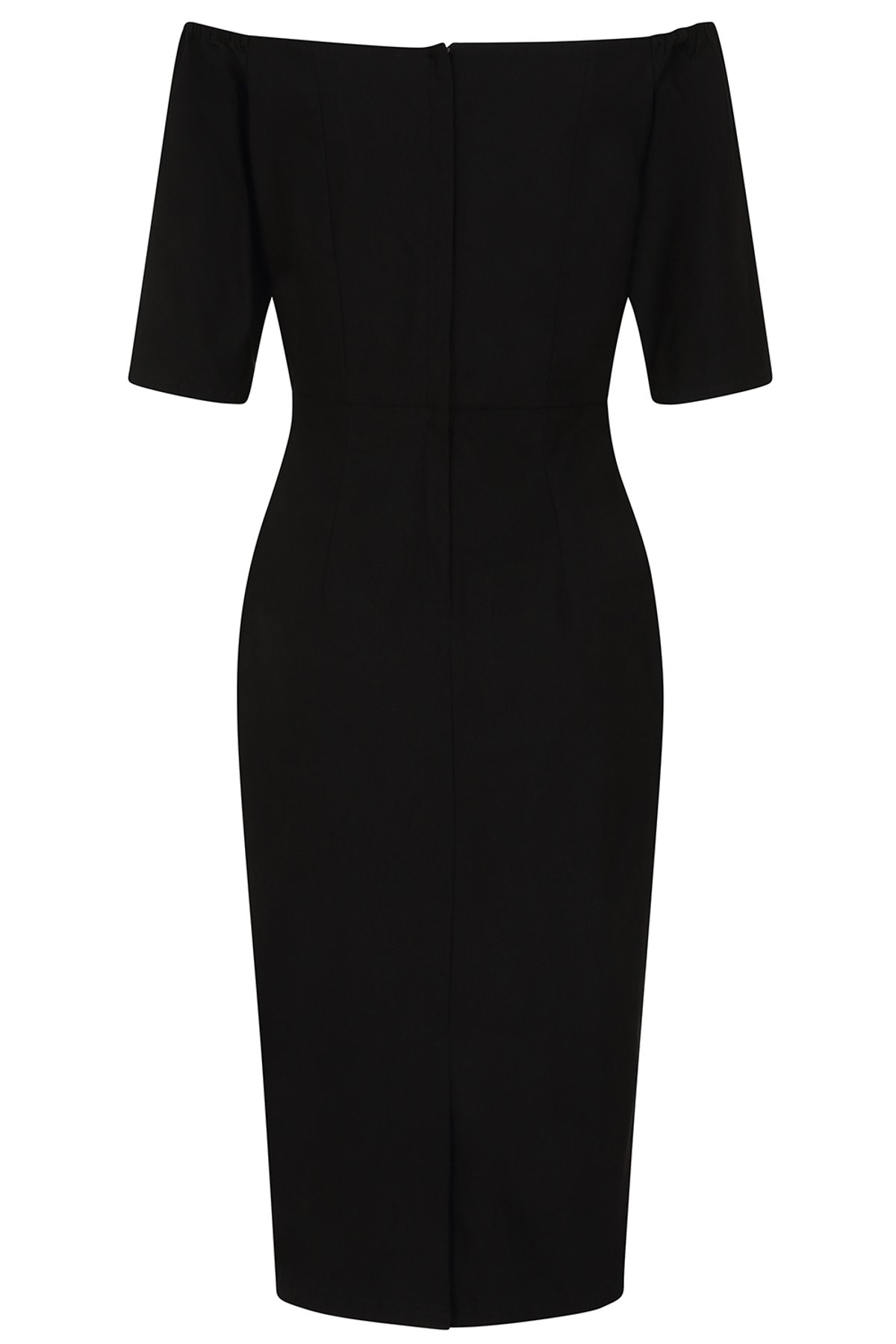 Pin up inspired pencil dress with wide neckline.