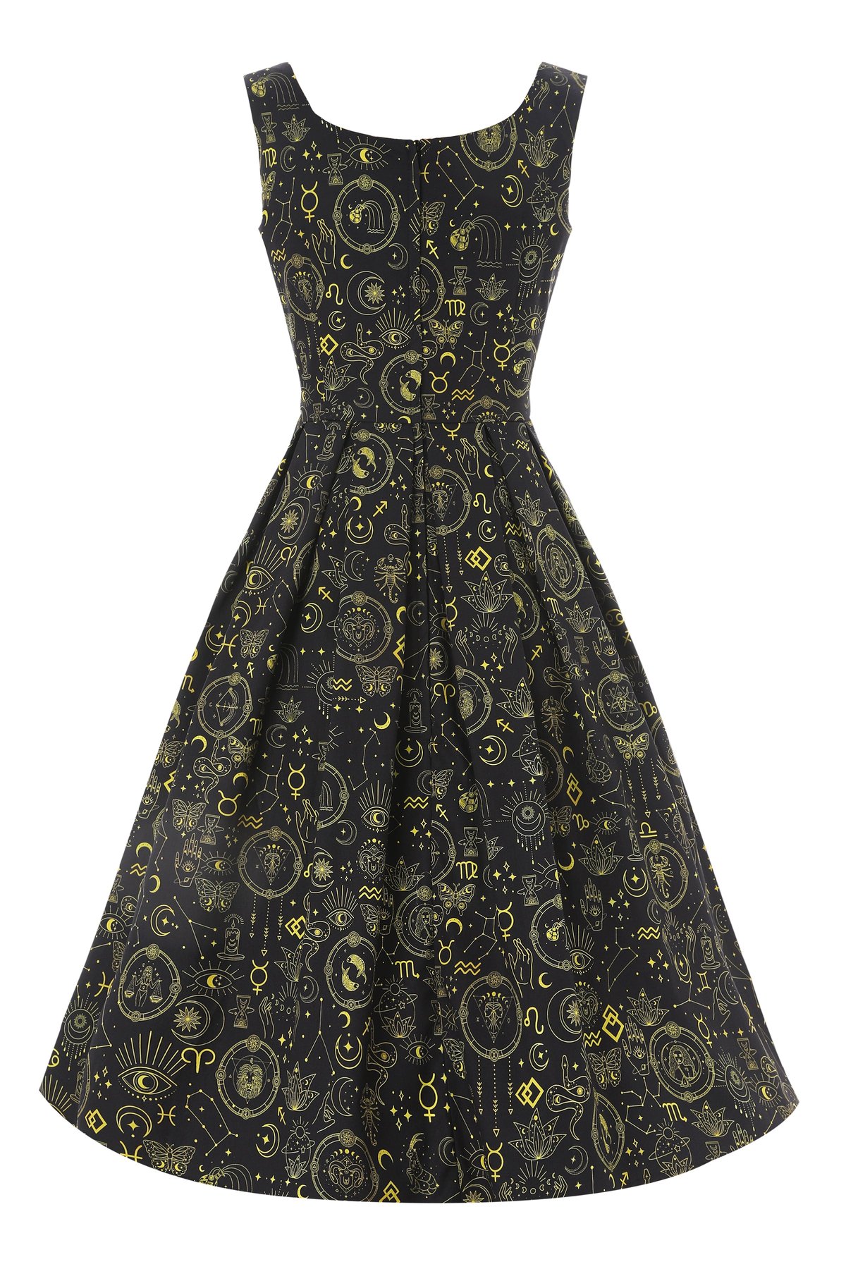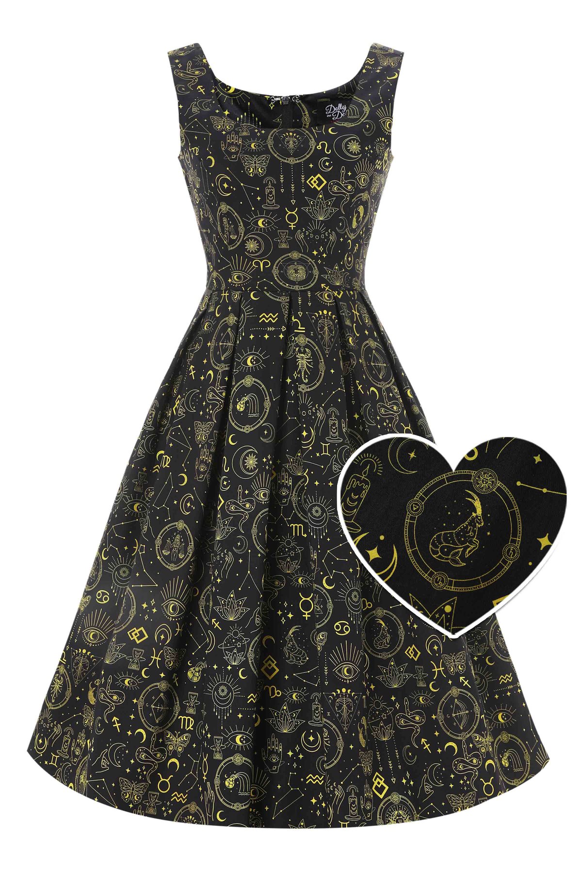 Unleash your inner starlet in our Amanda Black Gold Horoscope Swing Dress — where vintage glamour meets a celestial twist. The striking black fabric is beautifully adorned with shimmering gold horoscope symbols, casting a subtle sparkle with every step you take. The figure-flattering bodice and playful flared skirt create a silhouette that’s both timeless and irresistibly playful. From romantic nights out to daytime adventures, this dress promises to turn heads and make a statement that’s truly *purrfect*.
