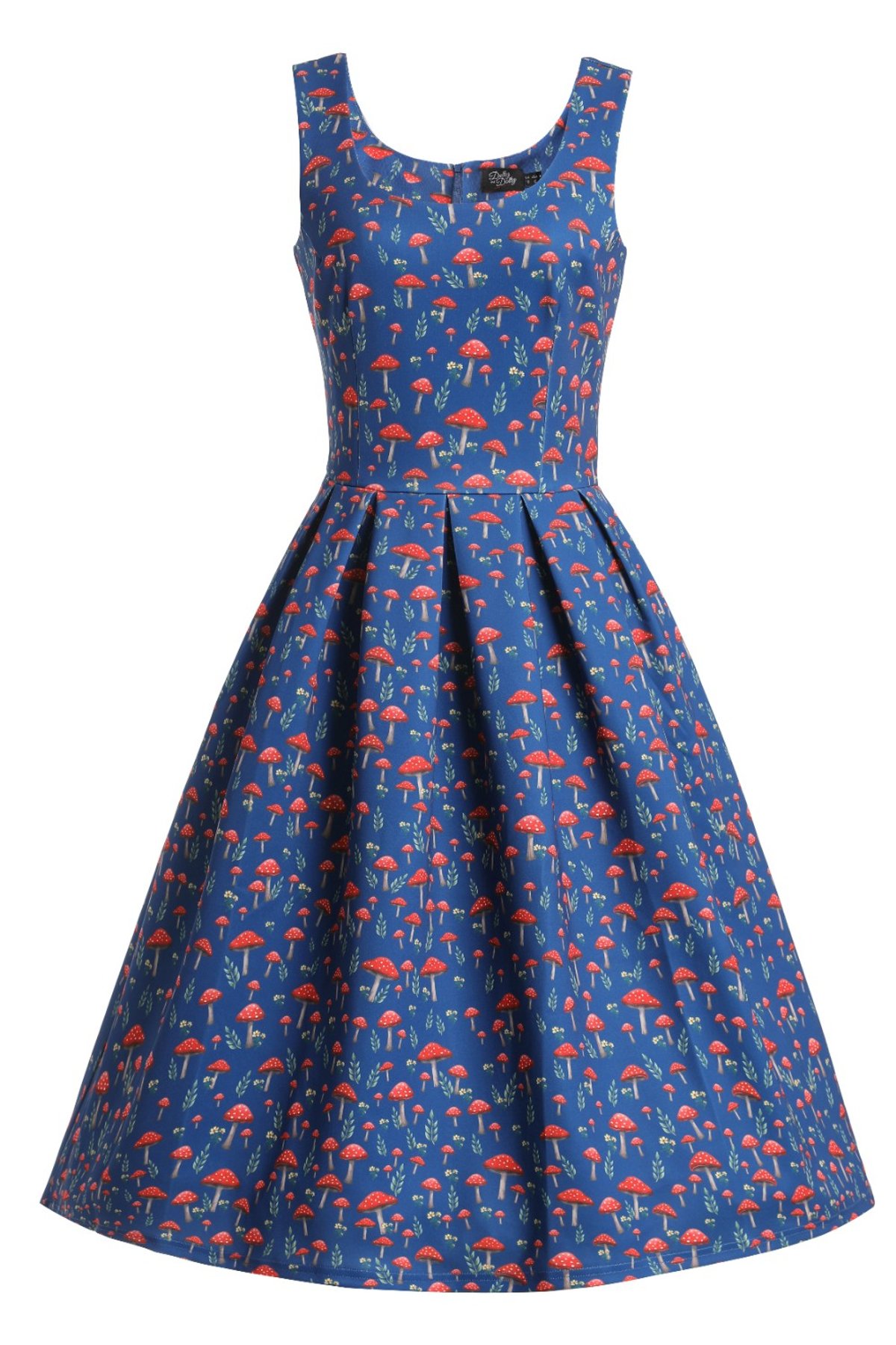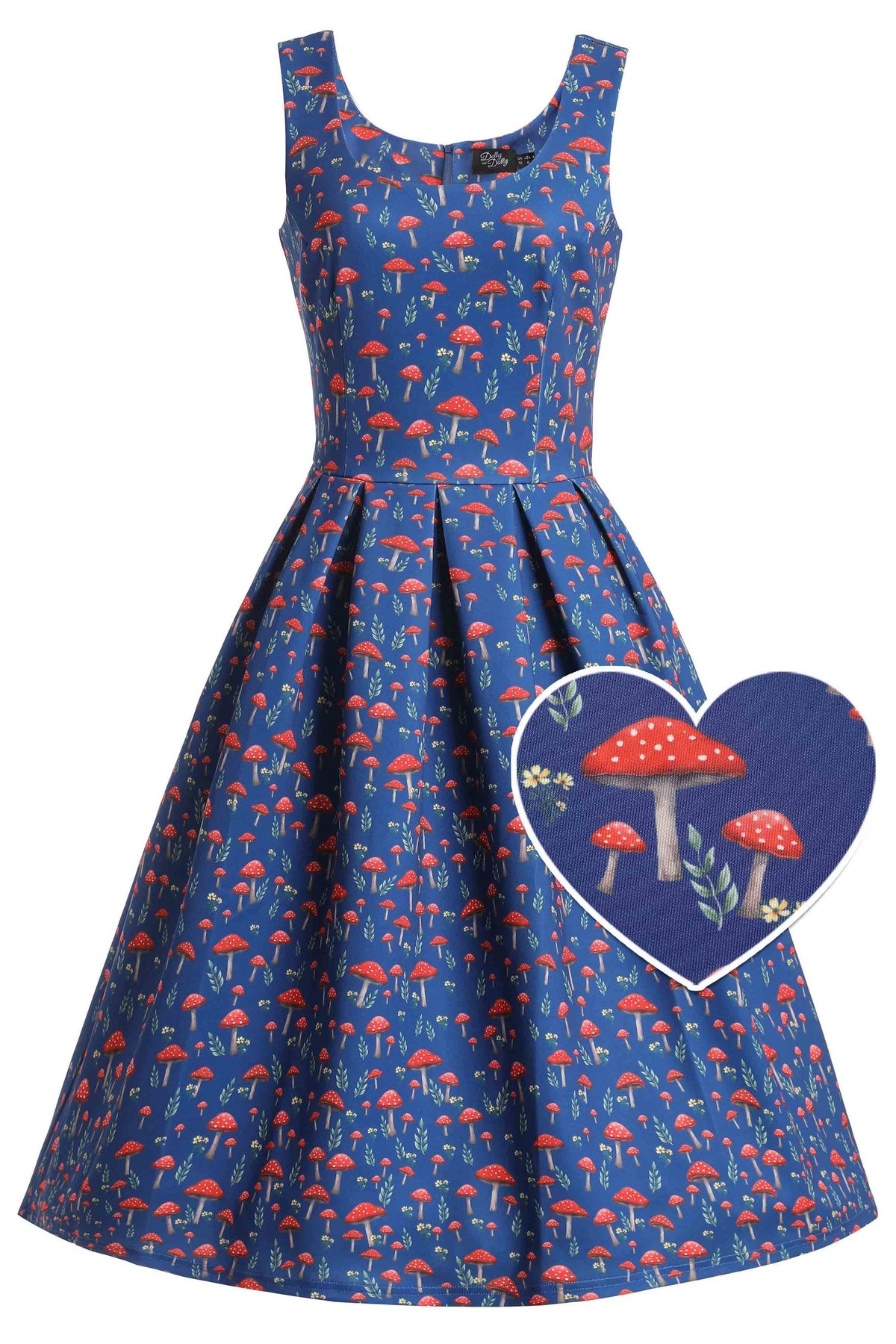 Step into a whimsical world where vintage charm meets playful flair with the Amanda Blue Red Mushroom Sleeveless Dress. This delightful piece is a true conversation starter, thanks to its charming mushroom print that’s as sweet as a cat’s purr. The figure-hugging bodice and vintage-inspired box-pleated skirt create a silhouette that’s both flattering and irresistibly fun. Crafted from a soft, stretchy blend, it offers all-day comfort while making sure you look *claws-down gorgeous* at every turn. Whether you're heading to a garden party or brunching with friends, this dress invites a little mischief and a lot of style into your wardrobe.