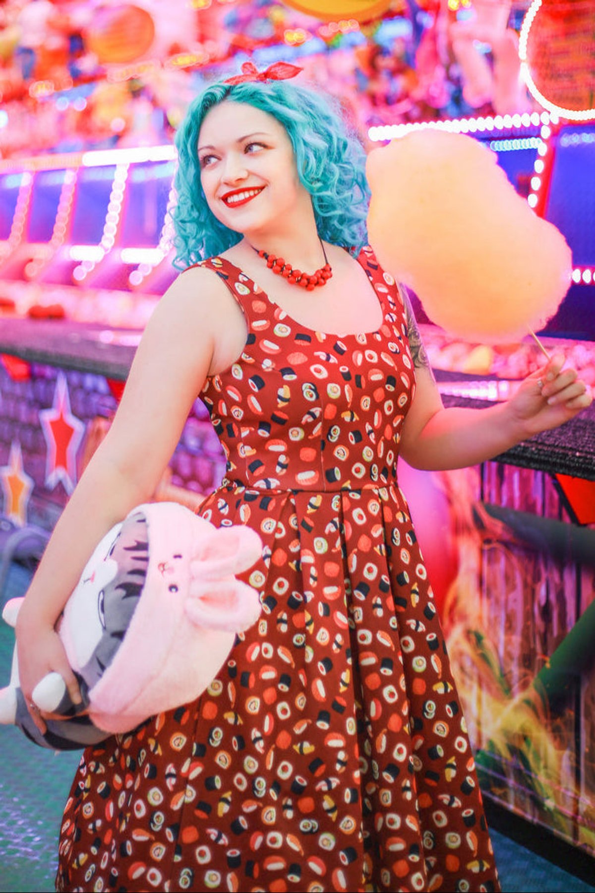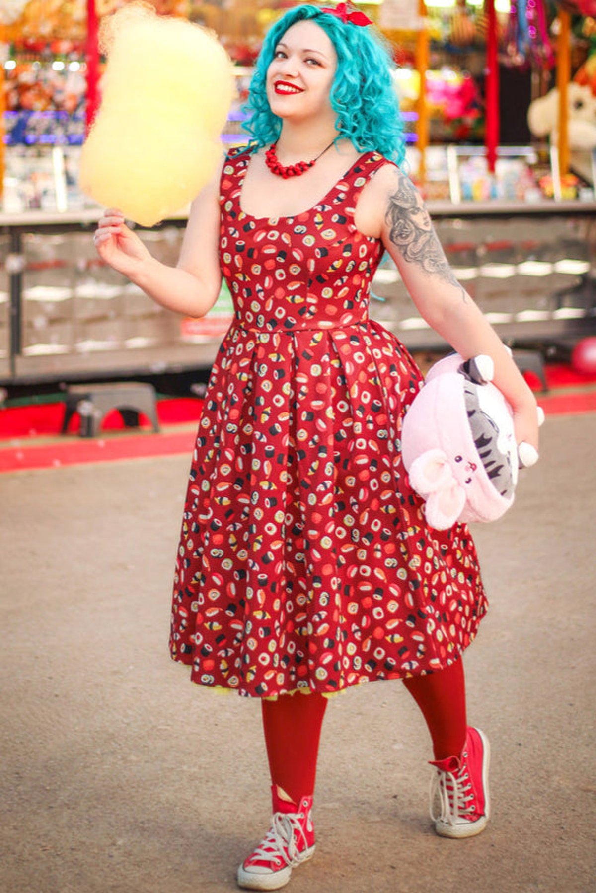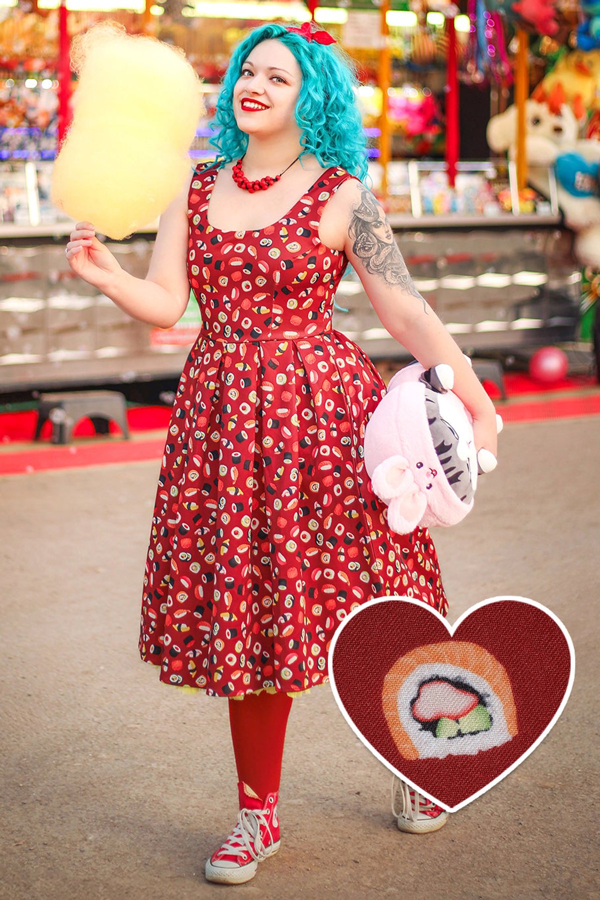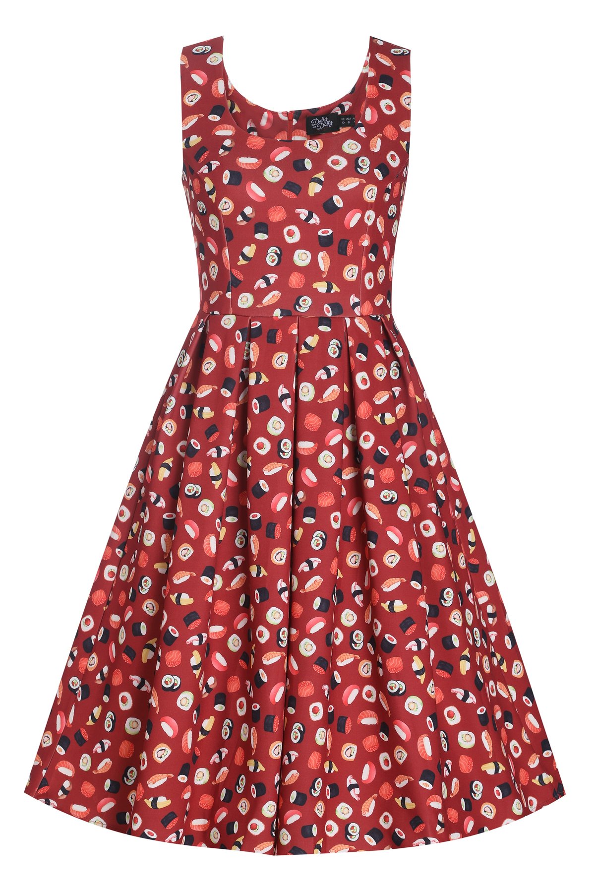 Unleash your fun side with the Amanda Burgundy Quirky Sushi Print Dress—a true showstopper that effortlessly blends playful charm with chic sophistication. The rich burgundy hue serves as the purrfect backdrop for the whimsical sushi print, making this dress a delightful statement piece. Its flared skirt swirls with every move, giving you that irresistible sense of movement and flair, while the stretchy fabric ensures you stay comfy enough to conquer your day in style. The fitted waistline accentuates your curves, and the sleeveless design keeps things breezy and light. Whether you're feeling mischievous or just want to make a subtle splash, this dress is your new go-to for fun, fashionable moments.