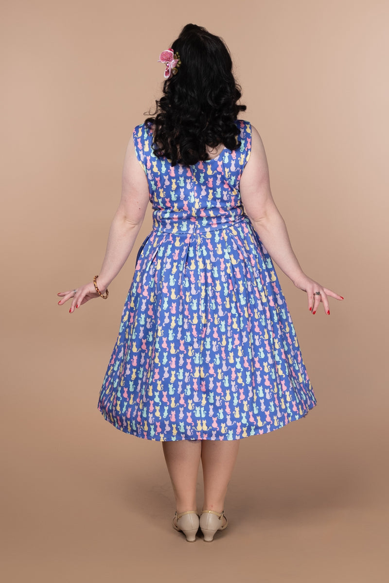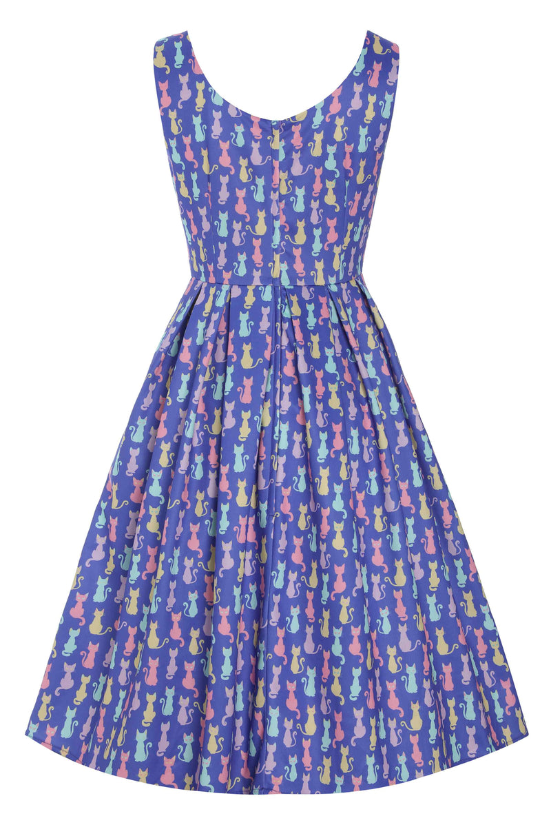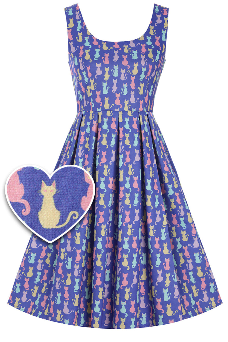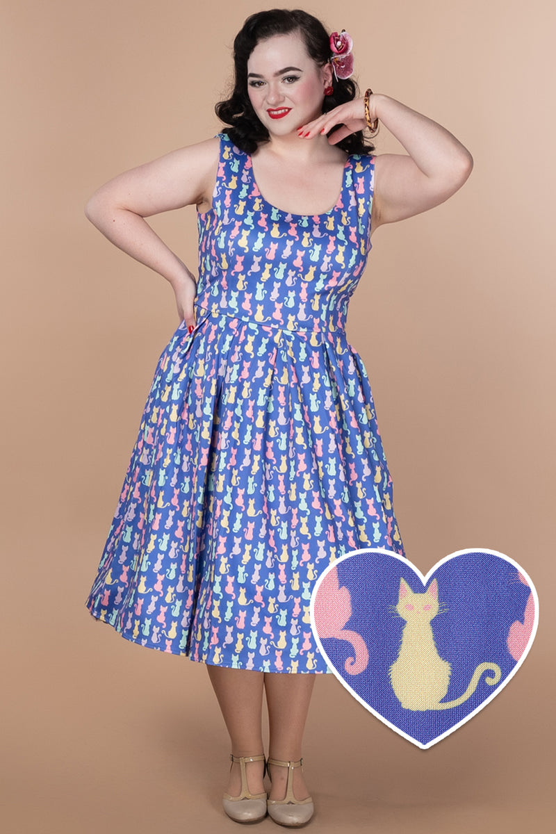 Unleash your feline fabulousness with the Amanda Multicoloured Cat Swing Dress—it's a paw-sitively purrfect blend of retro charm and playful sophistication. The vivid cat silhouettes dance across the fabric, making every step you take a statement of quirky chic. With its flattering swing hem and fitted bodice, this dress is designed to make you feel claw-downgorgeous, whether you're twirling at a vintage soirée or sashaying through a city street. Its bold hues and feline-inspired print bring a splash of fun and flair to any wardrobe, ensuring you'll always be the cat's whiskers in the room.
