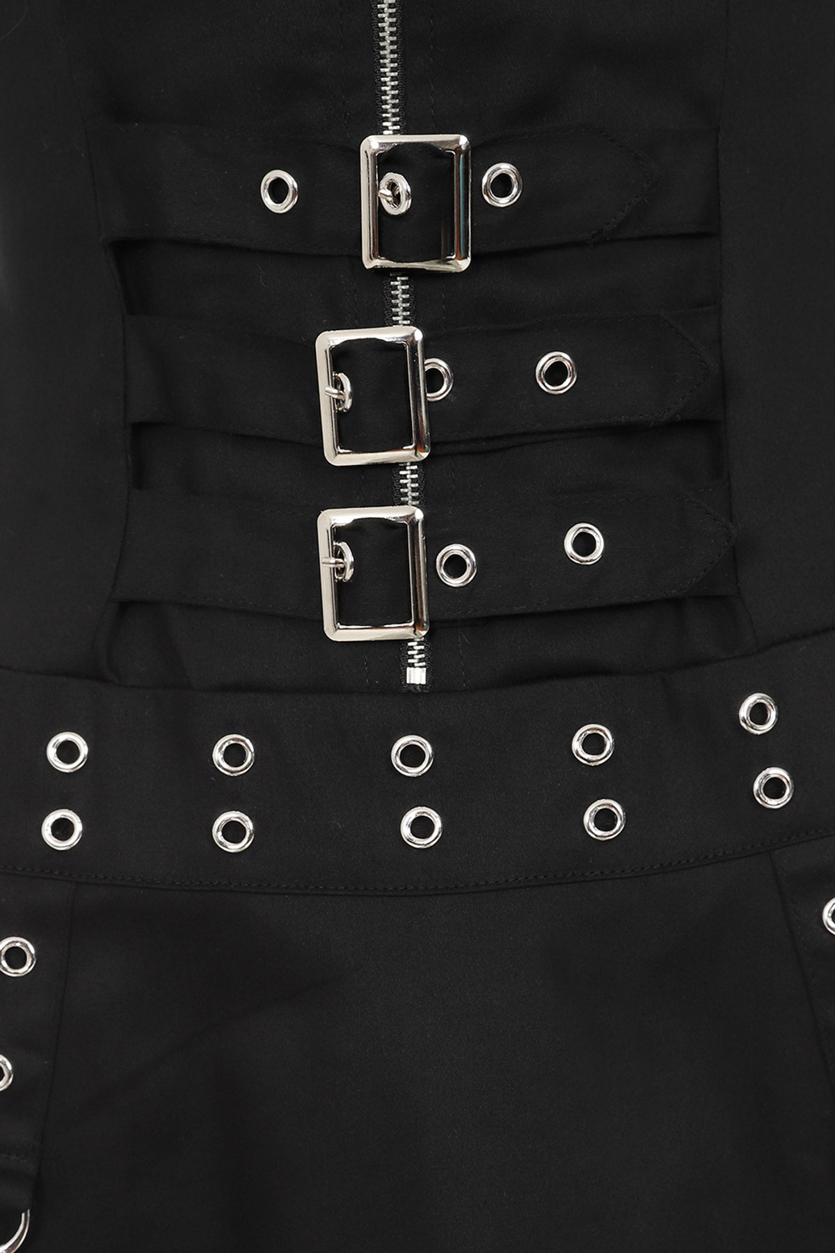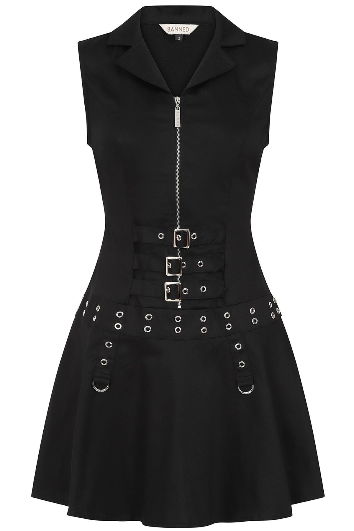 This dress is a black sleeveless mini dress with a zip-front closure, designed in a bold gothic and punk-inspired style. It features buckle accents on the waist, a belt with grommet detailing, and a flared skater-style skirt for a flattering silhouette. Perfect for alternative fashion lovers, this dress offers a unique mix of edgy and chic, ideal for casual outings, concerts, or statement fashion moments.