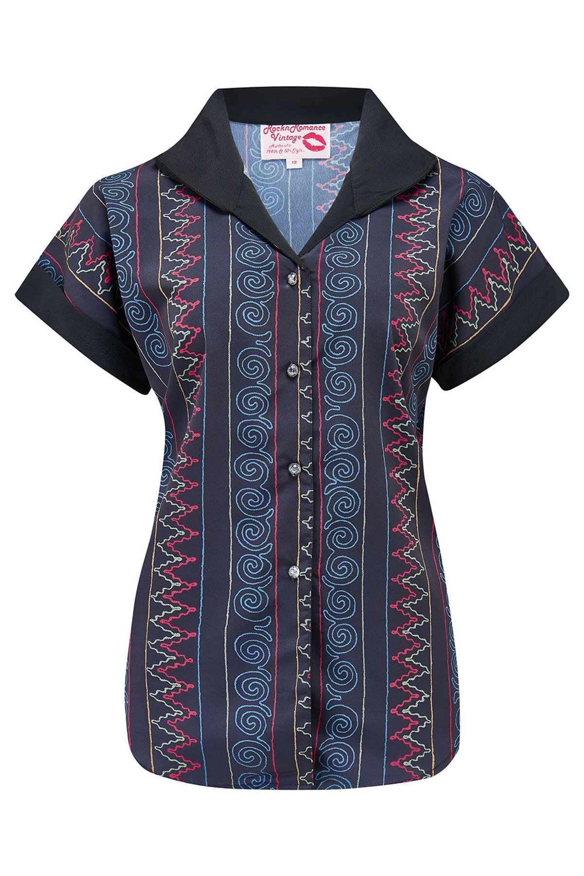 Dive into vintage chic with our Authentic 1950s Maria Blouse. 👚 This playful number is the perfect addition to your wardrobe. With a lively zigzag and swirl pattern on a navy canvas, it screams vintage charm. The Maria Blouse pairs delightfully with jeans or a swing skirt – your choice!