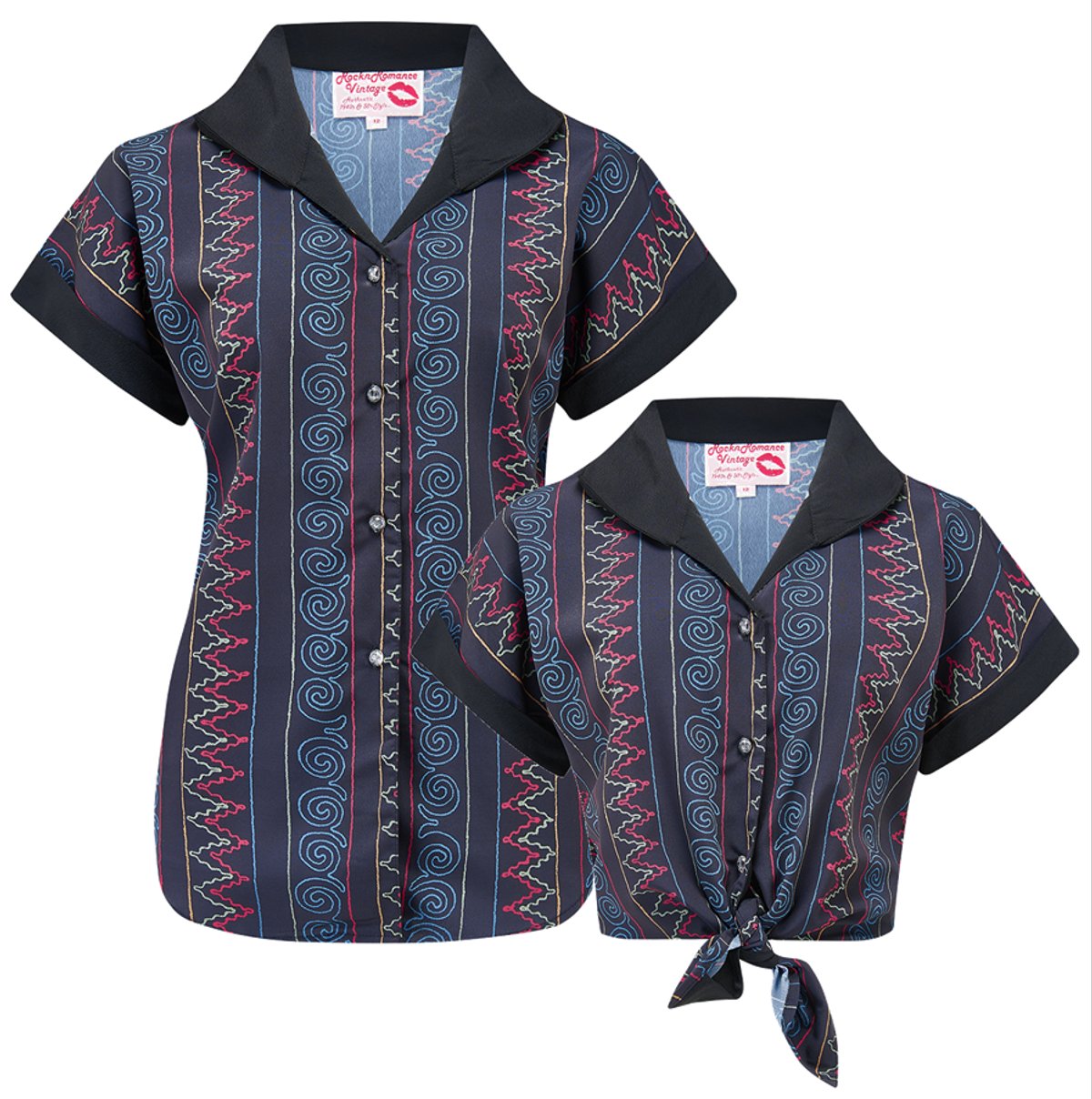 Step into a world where vintage meets vogue with our Tuck in or Tie Up Maria Blouse in Panama Stitch Print. This little marvel is a purrfect blend of 1950s charm and contemporary flair. The playful zigzag and swirl pattern dances across the navy canvas, making it impossible not to turn heads. Whether you opt to tuck it in for a polished look or tie it up for a flirty twist, this blouse effortlessly elevates your style game. Crafted from authentic Poly Crepe, it offers a soft, drapey feel with a touch of retro sophistication, all while being easy to care for with a quick machine wash. It’s a purrfect choice for those who love to mix vintage vibes with modern ease.