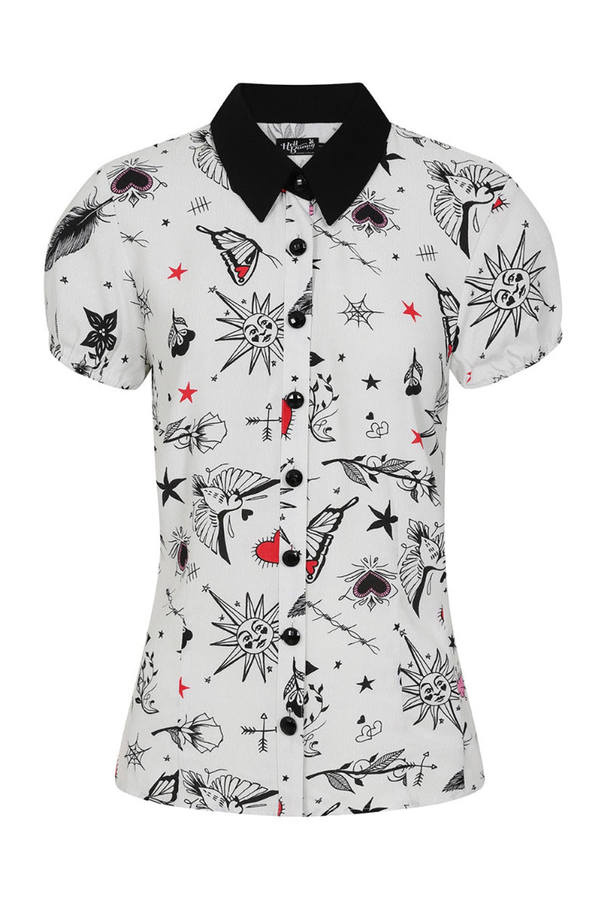 Unleash your inner feline fashionista with the Avery Blouse — a true purrfection in casual chic. Its striking abstract print, accented with bold tattoo-inspired motifs in black and red, makes a purrfect statement, while the crisp white backdrop keeps it fresh and versatile. The sleek pointed collar and cascading buttons add a touch of sophistication, and the elasticated cuffs on the short sleeves promise both comfort and flair. Crafted from breezy viscose, this top is designed to keep you looking claw-down gorgeous, whether you're out exploring or enjoying a casual hangout. The hip-length cut flatters all figures, making it a stylish yet easy choice for day-to-day adventures, with just enough edge to stand out from the crowd.