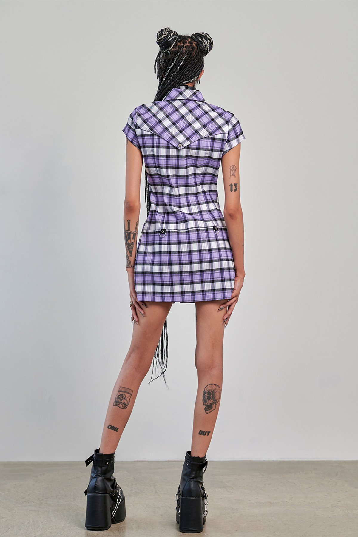 This plaid mini dress from Banned Alternative fuses classic punk style with modern edge. Designed in a structured, tailored silhouette, it features a fitted bodice with cap sleeves, a pointed collar, and a full-length silver zip down the front with an O-ring pull. The pastel tartan pattern gives it a playful, grunge-inspired look, while bold hardware detailing like the silver eyelets, decorative buckle straps at the hips, and a snap-button chest flap adds a rebellious touch. The back includes subtle shaping seams, a yoke detail, and button accents at the waist for added structure. Perfect for pairing with platforms or layering with fishnets, this dress delivers alt-girl attitude with a pastel punk twist.