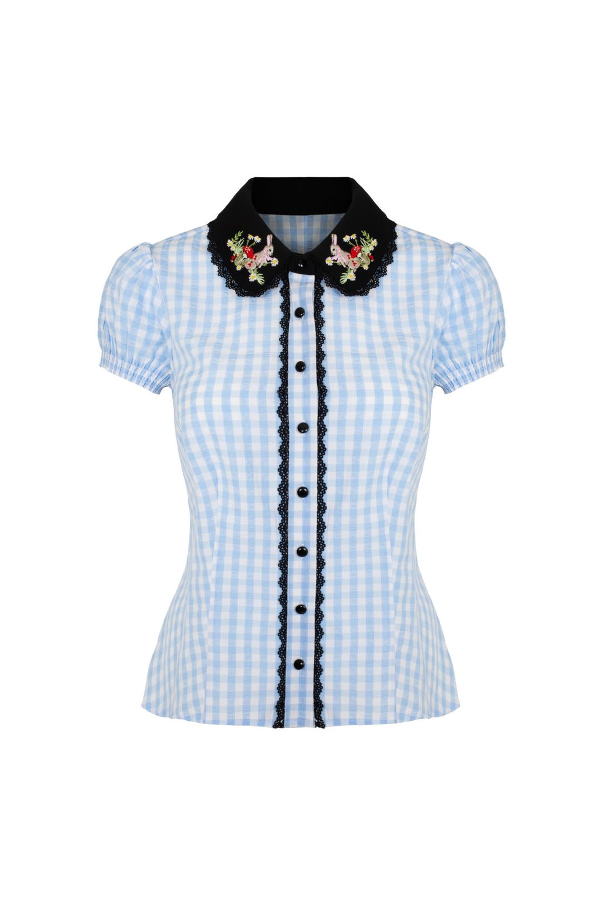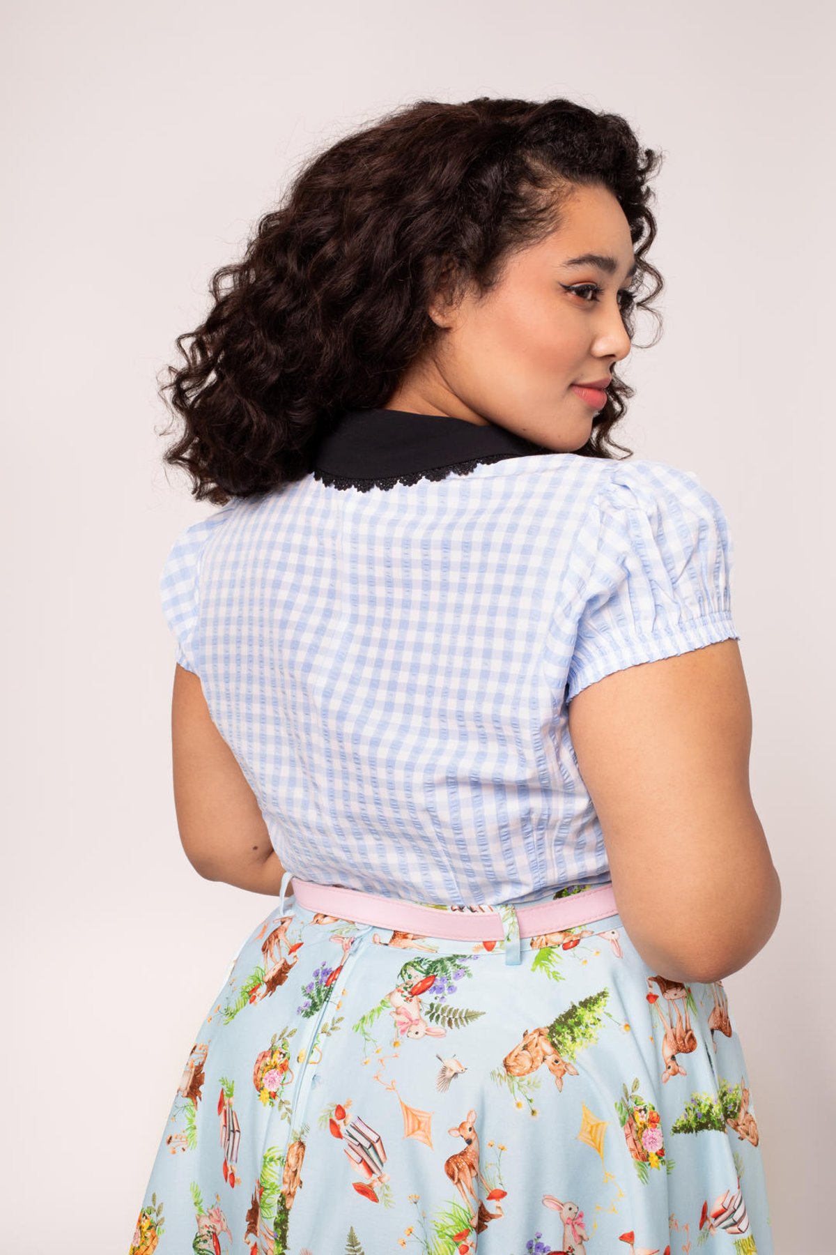 😍 Get ready to channel your inner retro queen with our vintage-inspired Beatrix Blouse! This gorgeous blue gingham creation is the perfect blend of charm and cheekiness 👛With a contrasting black collar decorated with delicate lace trim, this blouse also features an adorable woodland bunny embroidery 🐰
