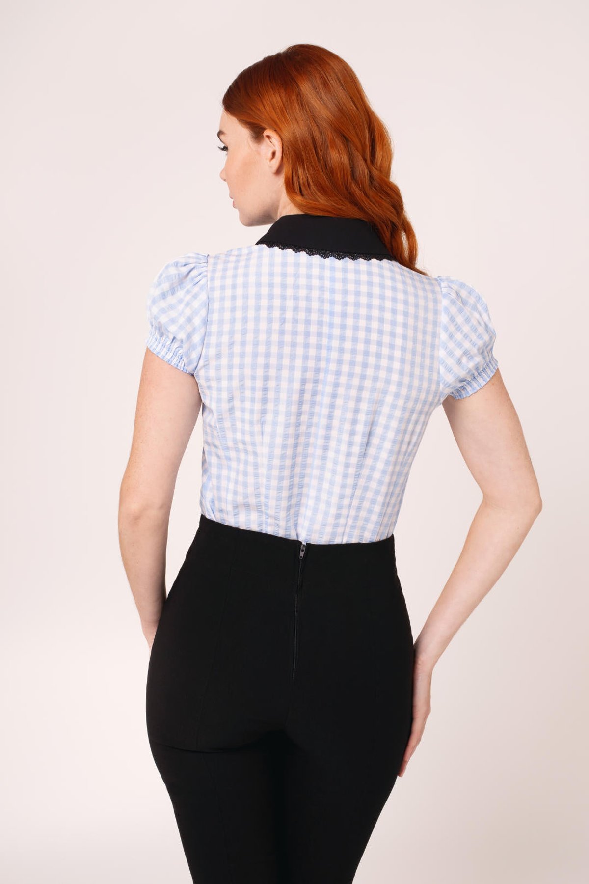 Unleash your inner retro siren with the Beatrix Blouse—where playful gingham meets charming details. The light blue fabric is a lovely canvas for the contrasting black collar, lace trim, and adorable woodland bunny embroidery, making this piece a purrfect blend of sweet and sassy. It’s designed with a semi-fitted silhouette that cinches at the waist, giving you that flattering vintage-inspired shape, while delicate puff sleeves add just the right touch of coquettish charm. Crafted from lightweight polyester, it’s as easy to care for as it is to style—ready to turn heads wherever you go.