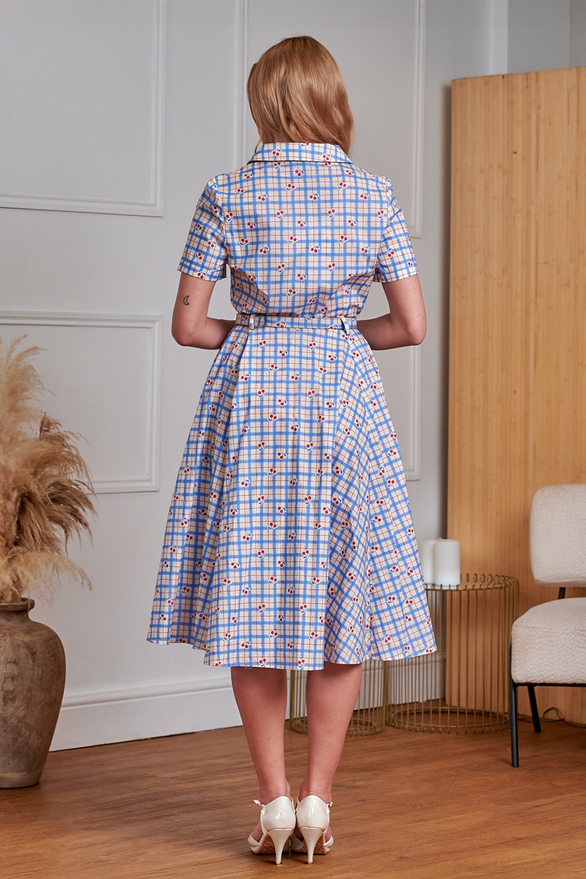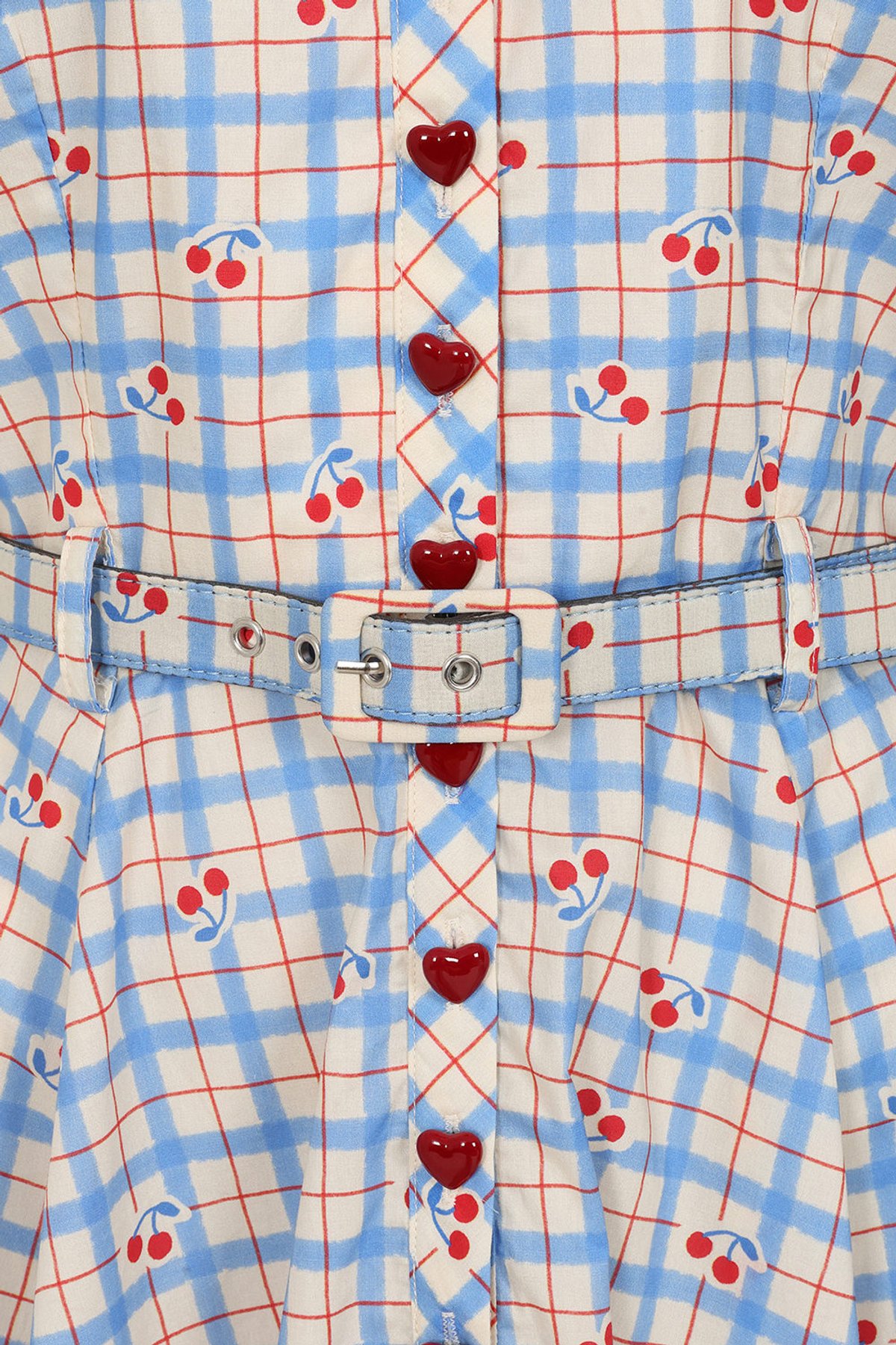 This Banned Retro 50’s inspired flare button dress is a cherry lovers dream! This cute cherry blue check print in a 100% breathable light cotton is perfect for summer. This dress sports adorable cherry red heart buttons, front button opening, side seam pockets and a very cute belt in the cherry print. This dress is sure to brighten up anyones day!