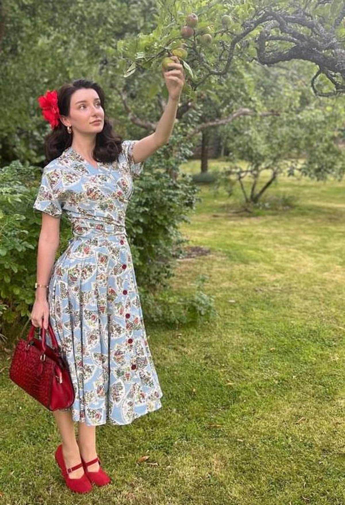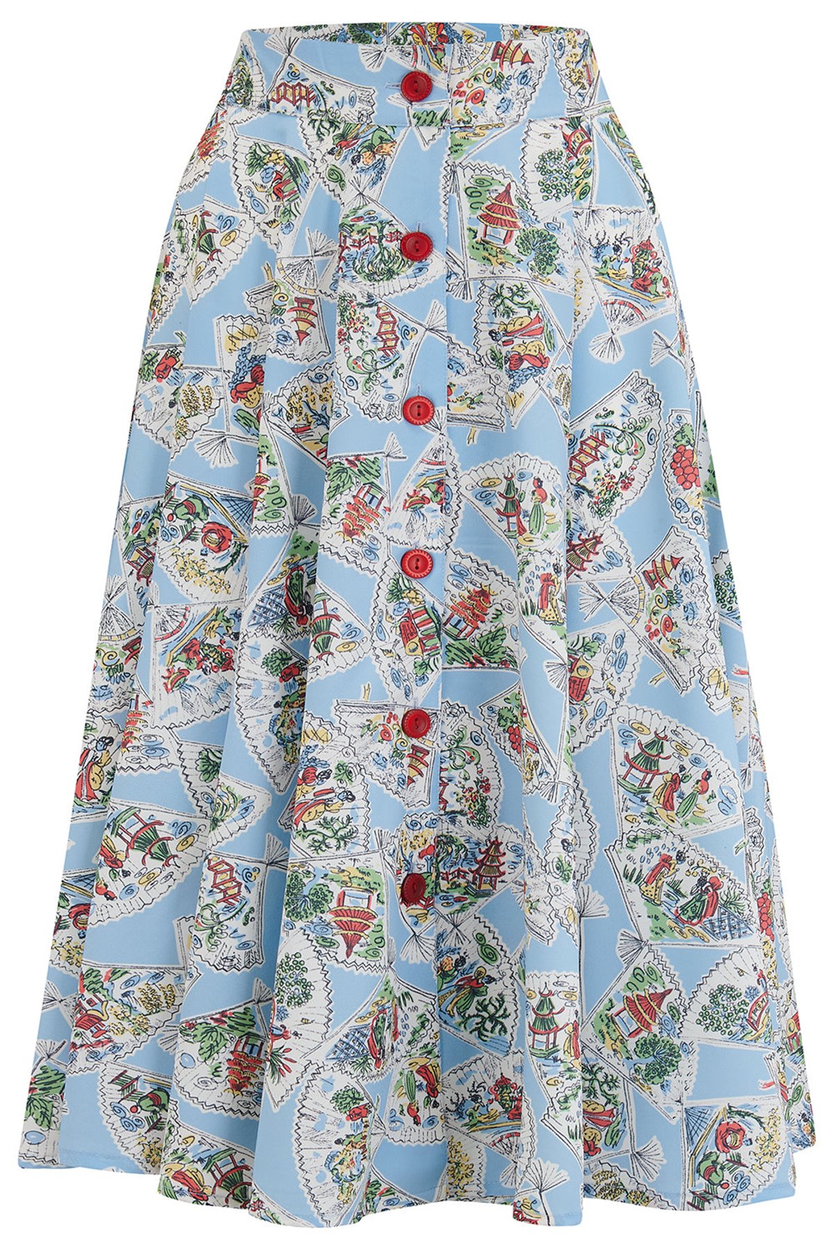 Unleash your inner vintage vixen with the Beverly Button Front Full Circle Skirt, where timeless elegance meets a splash of playful charm. The vibrant pagoda print in bold blues and fiery reds makes every step a statement, while the high-waisted silhouette and full-circle design invite you to twirl your way into unforgettable moments. Crafted from a soft yet resilient fabric, this skirt promises a purrfect blend of comfort and style—ideal for those who love to turn heads with a hint of retro glamour. Its practical pockets add a paw-sitive touch of convenience, so you can keep your essentials close without missing a beat of your fabulous flow.