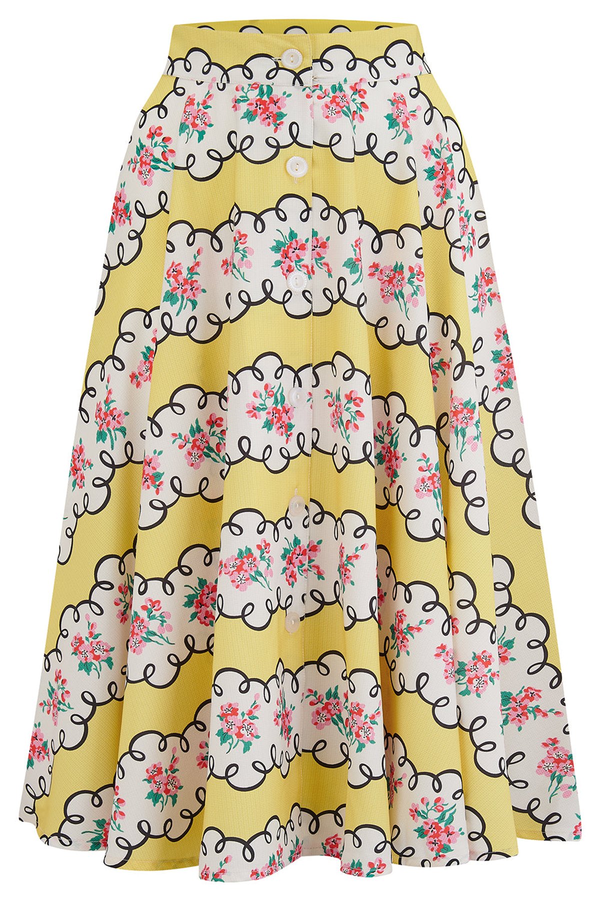 Step into the spotlight with the Beverly Button Front Full Circle Skirt, a playful dance of vintage charm and modern flair. Its cheerful yellow and white floral print is as bright as your personality, while the high-waisted silhouette offers a claw-some fit that flatters your curves and twirls with your every move. Crafted from soft crepe, it glides effortlessly through your day, whether you're out for a breezy city stroll or a lively weekend gathering. With its delightful pockets, you’ll keep your essentials close — no fuss, just fabulousness. This skirt isn't just a pretty face; it’s a purrfect blend of style and practicality, ready to elevate your wardrobe with a pop of vintage elegance.