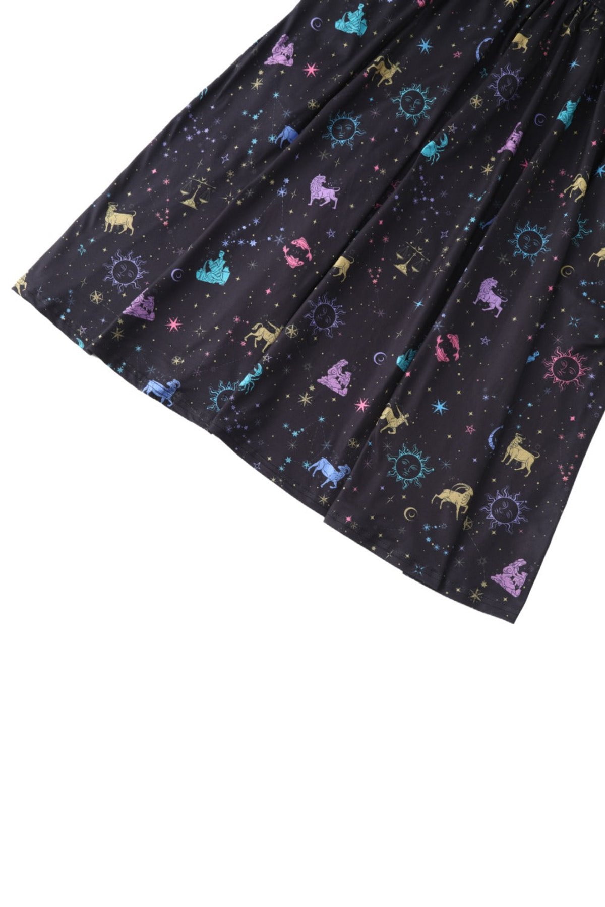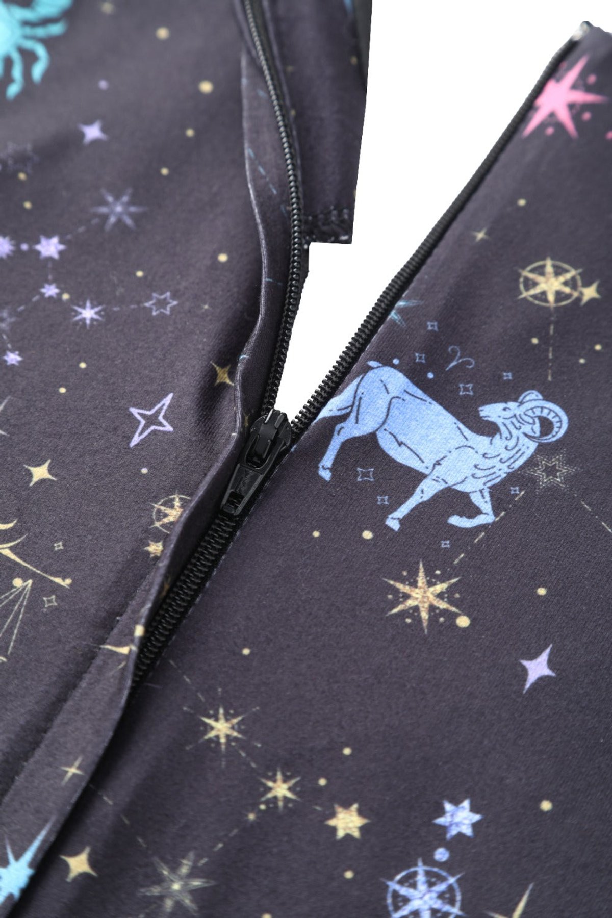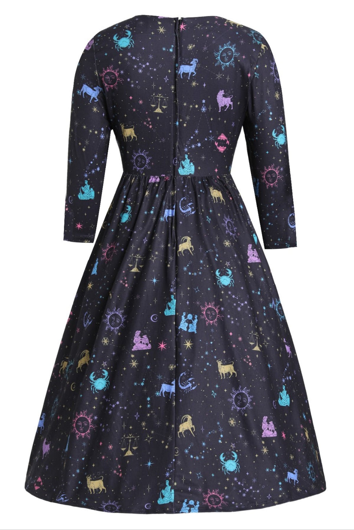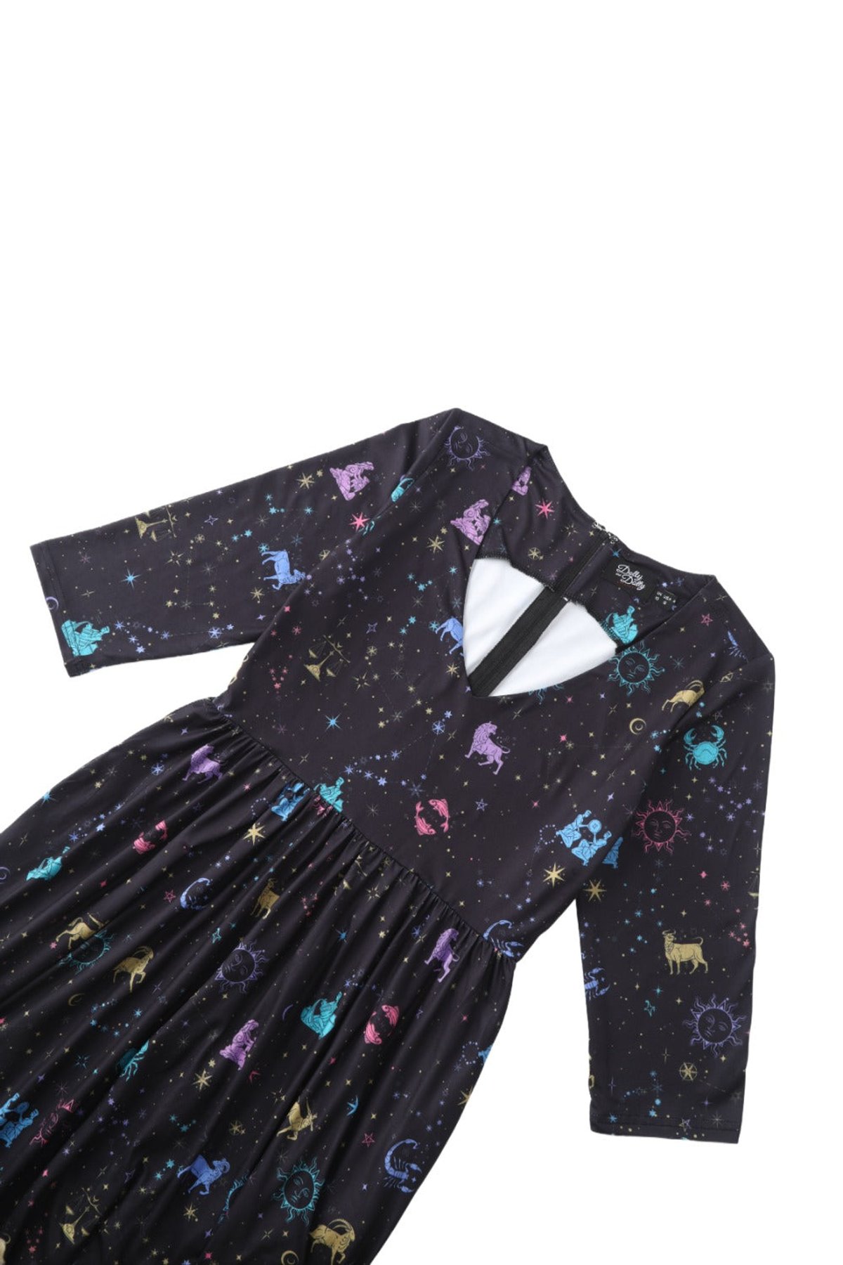 Get ready to turn heads in the Billie Black Glittering Horoscope Black Dress, where celestial chic meets vintage allure. With its cosmic horoscope symbols scattered across a sleek black canvas, this dress is truly purrfect for those who love a hint of mystical mystery combined with timeless style. The V-neckline and 3/4 sleeves create a flattering silhouette that’s both elegant and effortlessly cool, while the gathered waistline ensures you stay comfy as you soak up all the compliments. The below-the-knee A-line skirt invites twirls and dance-floor dazzles, and the clever side pockets are a delightful secret—perfect for stashing your essentials without missing a beat of the fun.