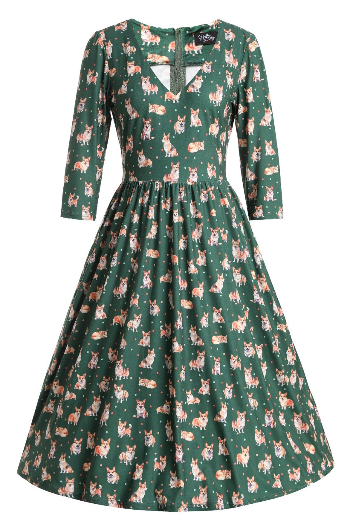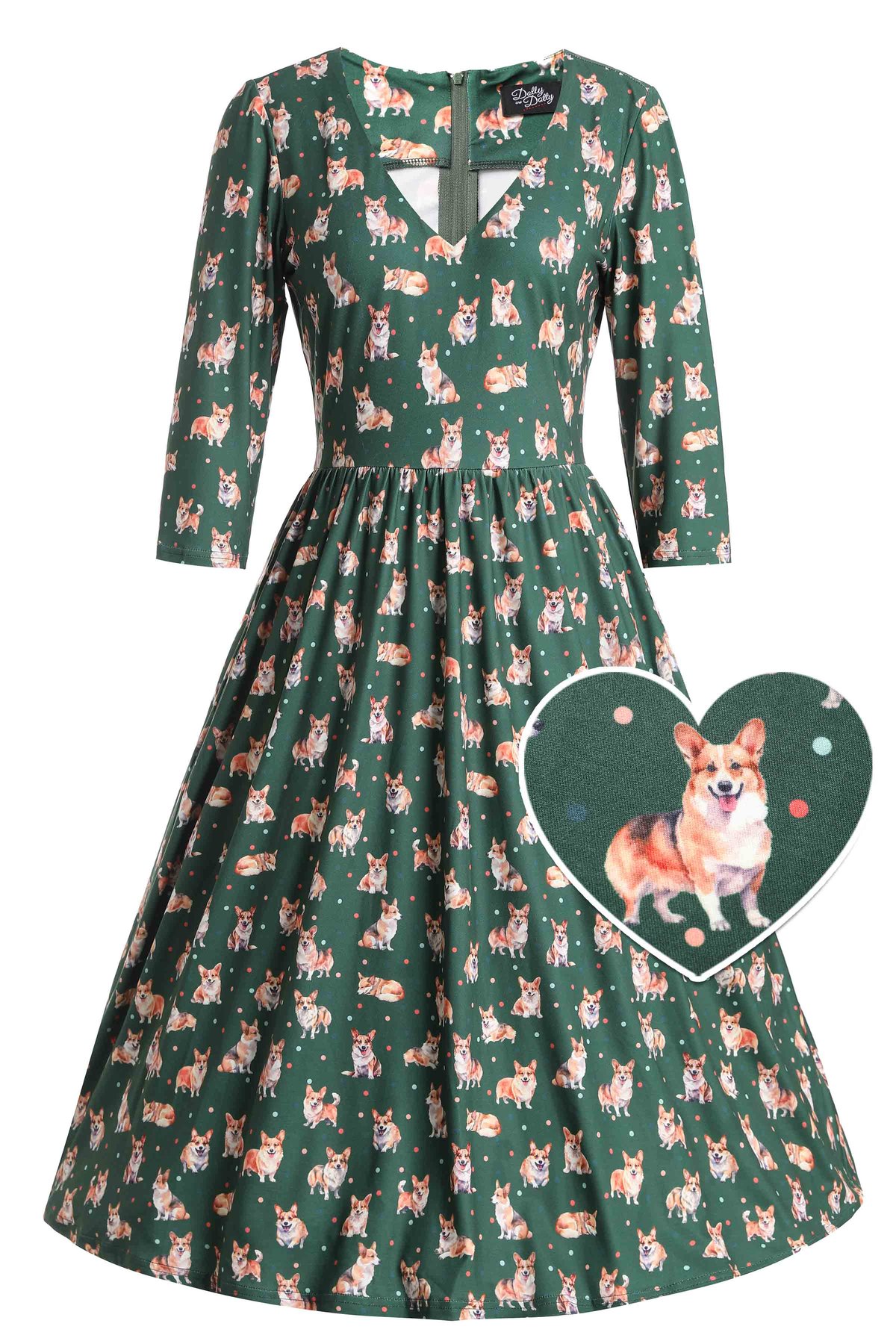 Get ready to turn heads in our Billie Green Corgi Flared Dress—a playful yet polished piece that’s as charming as it is claws-down gorgeous. The vibrant green hue pops with personality, while the whimsical corgi print and tiny polka dots add just the right touch of fun. With a flattering V-neckline and the perfect flared silhouette, this dress is your new go-to for effortless style, whether you’re lounging or striking a pose. Crafted from a soft, stretchy fabric, it drapes beautifully, giving you comfort that’s simply irresistible. The knee-length A-line skirt swings with every step, making it perfect for twirling or just feeling fabulous wherever your day takes you. That dash of vintage whimsy is sure to make you the star of any winter outing.