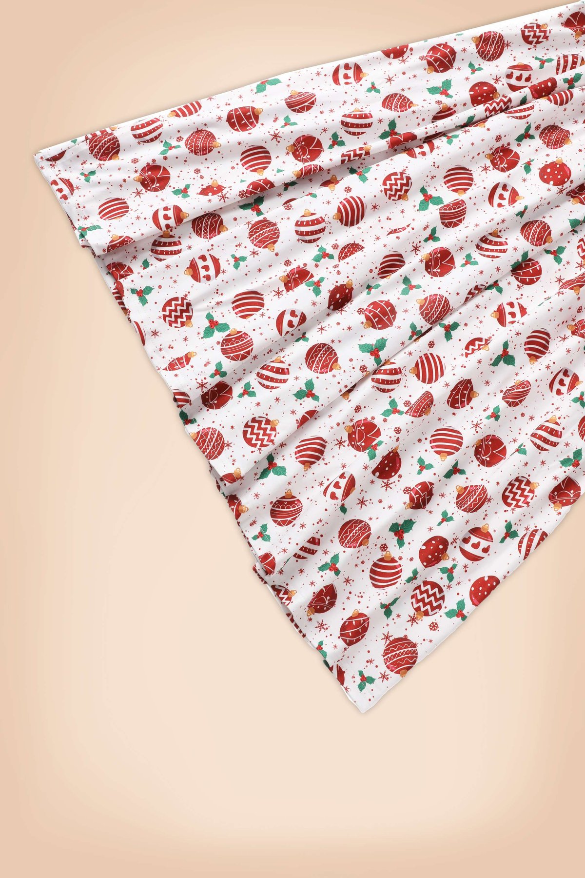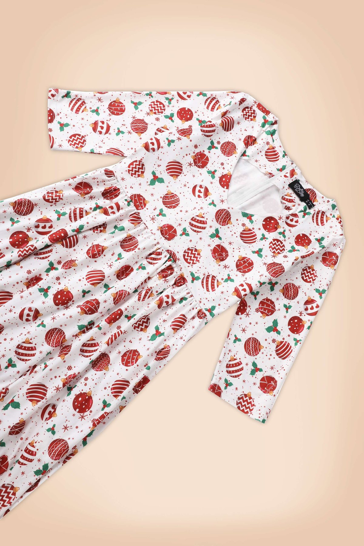 Get ready to sleigh the holiday season with the Billie Red Bauble Long Sleeved Dress—where festive charm meets effortless chic. The crisp white backdrop adorned with playful red baubles and holly makes this frock a true showstopper. The flattering V-neckline and gathered waistline create a silhouette that’s as enchanting as a winter’s night, while the comfortable stretch fabric ensures you stay cozy enough to dance the night away. Whether you're twirling under the mistletoe or mingling at festive gatherings, this dress will have you feeling as radiant as a Christmas star.