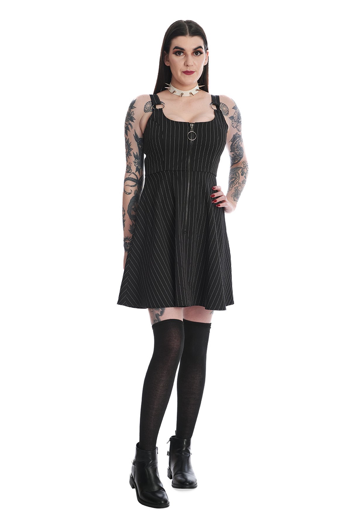 Unleash your inner vixen with the Black Bellona Pinstripe Dress—a perfect harmony of gothic allure and vintage flair. Its sleek, fitted bodice and flared skirt create a silhouette that's both figure-flattering and fearlessly fabulous. The timeless black and white pinstripe pattern adds a touch of retro sophistication, while the fabric’s stretch ensures you stay purrfectly comfortable whether you're out for a night of mischief or a casual day look. With its subtle nod to the 1950s rockabilly vibe, this dress is a true showstopper that effortlessly commands attention and admiration.