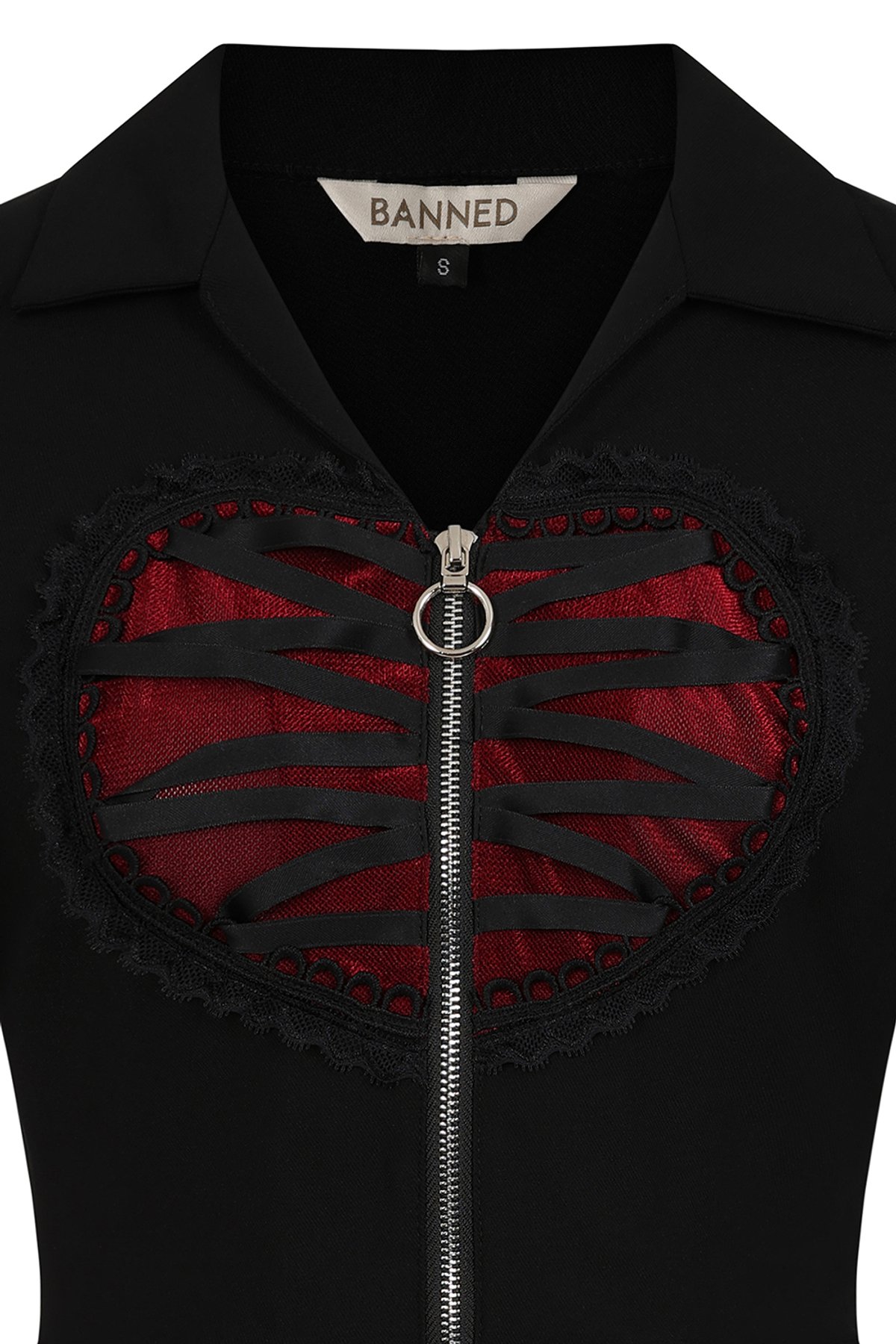 Unleash your inner enchantress with the Black ELYSIA DRESS—a striking blend of dark romance and daring style. The sleek black fabric is beautifully accented by fiery red details that add just the right amount of mystery. The puff sleeves and vintage-inspired collar lend a touch of timeless charm, while the front zipper and lace heart accents keep things modern and a little mischievous. Crafted from a luxe, stretchable blend, this dress fits like a dream and moves with you, whether you're twirling on the dance floor or slipping into a seductive gaze.