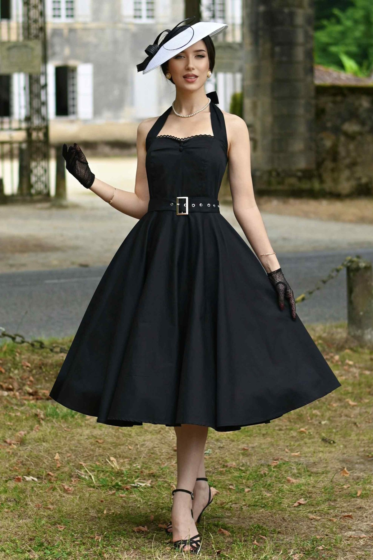 Unleash your inner vintage vixen with our Daisy Vintage Charm Black Halter Dress—an absolute showstopper that balances timeless elegance with a playful wink. The sultry sweetheart neckline and delicate lace trim are designed to flatter your figure, while the charming bow detail adds a dash of mischievous flair. The self-tie halter straps lift the look to full retro glamour, and the wide belt with a gleaming gold-tone buckle cinches you in for a sassy silhouette that’s a true paw-sitive. Crafted from a luxe cotton-elastane blend, this dress feels as fabulous as it looks, ensuring you stay comfortable and chic from dawn to dusk. Whether you're channeling classic Hollywood or turning heads at your next soirée, this dress is your ticket to claw-some style that’s both fierce and feminine.