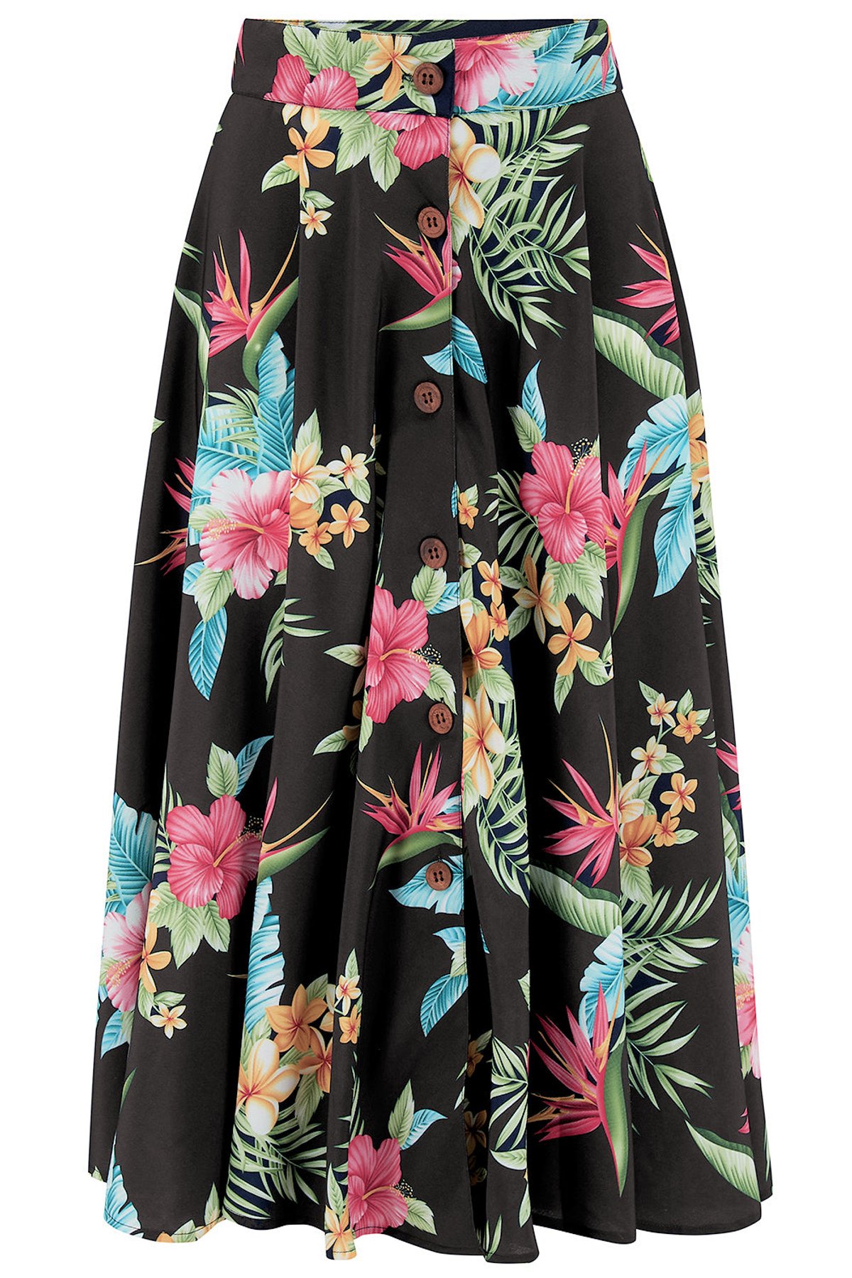Unleash your inner vintage vixen with a twist of modern mischief in the Beverly Button Front Full Circle Skirt. Its lush black Honolulu floral print dances with a playful charm, while the full, swoon-worthy silhouette promises to turn heads and stir envy. With a high-waisted fit that hugs and flows with feline finesse, this skirt is a purrfect blend of retro glamour and contemporary chic. Crafted from soft yet durable fabric, it moves as effortlessly as you do—whether you're twirling on the dance floor or strutting your style on the street. The charming pockets add a practical touch, because fashion should never be without function, darling. Perfectly versatile, it invites you to pair with anything from a sleek fitted top to a cosy knit, giving you endless ways to express your unique vibe.