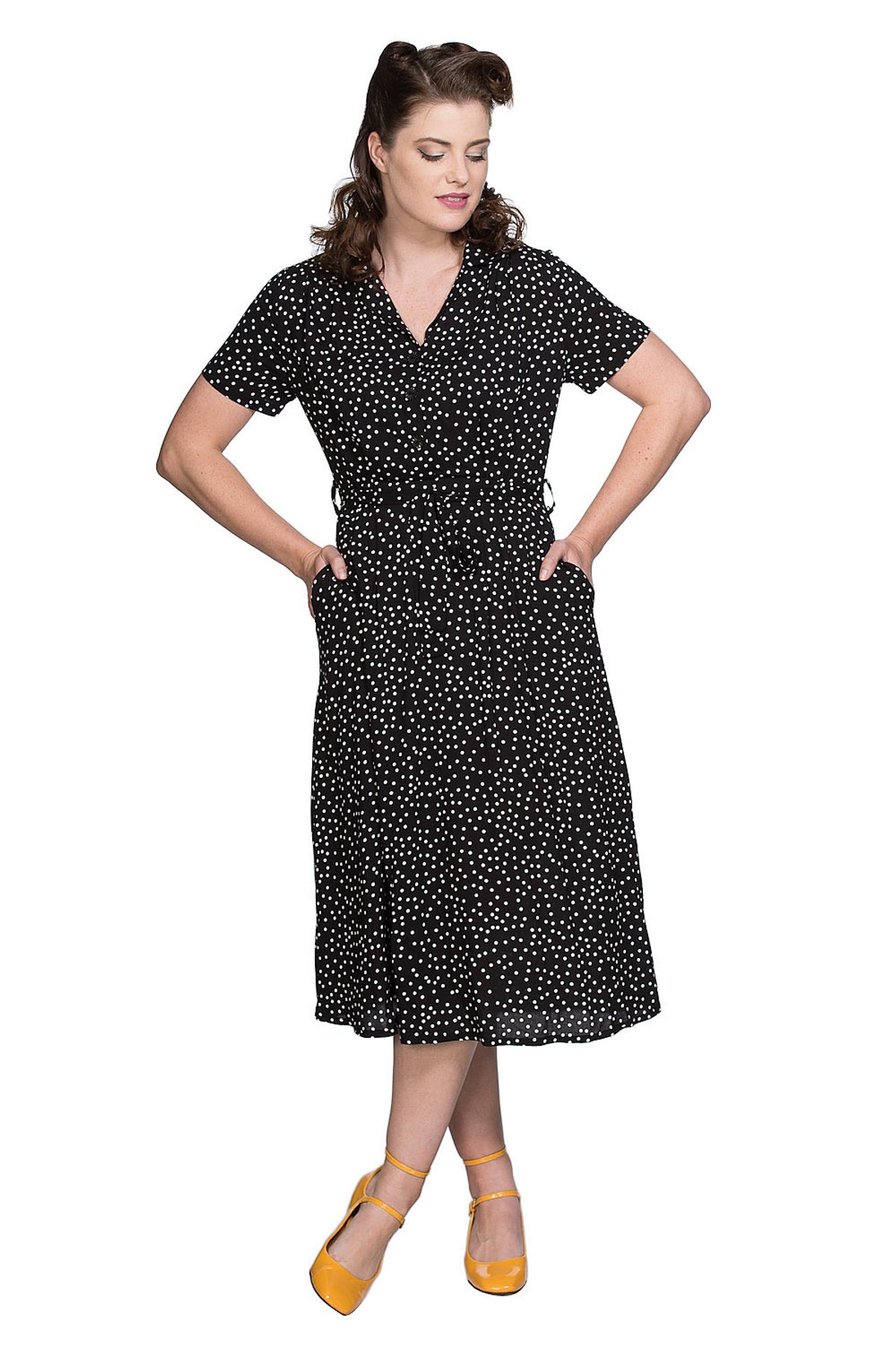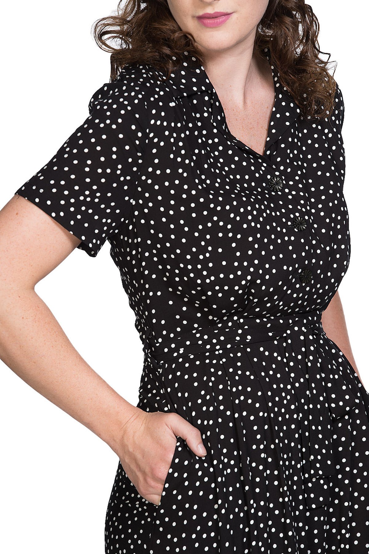 Get ready to turn heads in this purrfectly playful black polka dot dress that oozes vintage charm and modern chic all at once. The classic monochrome palette is a timeless choice, while the fifties-inspired tailoring ensures you look both structured and effortlessly elegant. With charming pleats dancing along the shoulders and skirt, this dress strikes the perfect balance between polished and playful—making it a true wardrobe staple for those who love to make an entrance, whether at a brunch or a midnight soirée. Crafted from luxe viscose, it feels as divine as it looks, and the waist belt cinches you in for that irresistibly flattering silhouette. The front button fastening adds a dash of practicality without sacrificing style, making it as functional as it is fabulous.