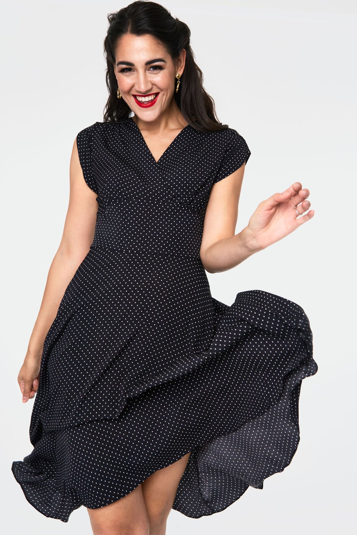 🎙️ Introducing our unforgettable Black Polka Dot Flare Dress 🖤. Unleash your playful side with this 50s-inspired beauty – a true modern classic in the world of vintage UK fashion. 👗