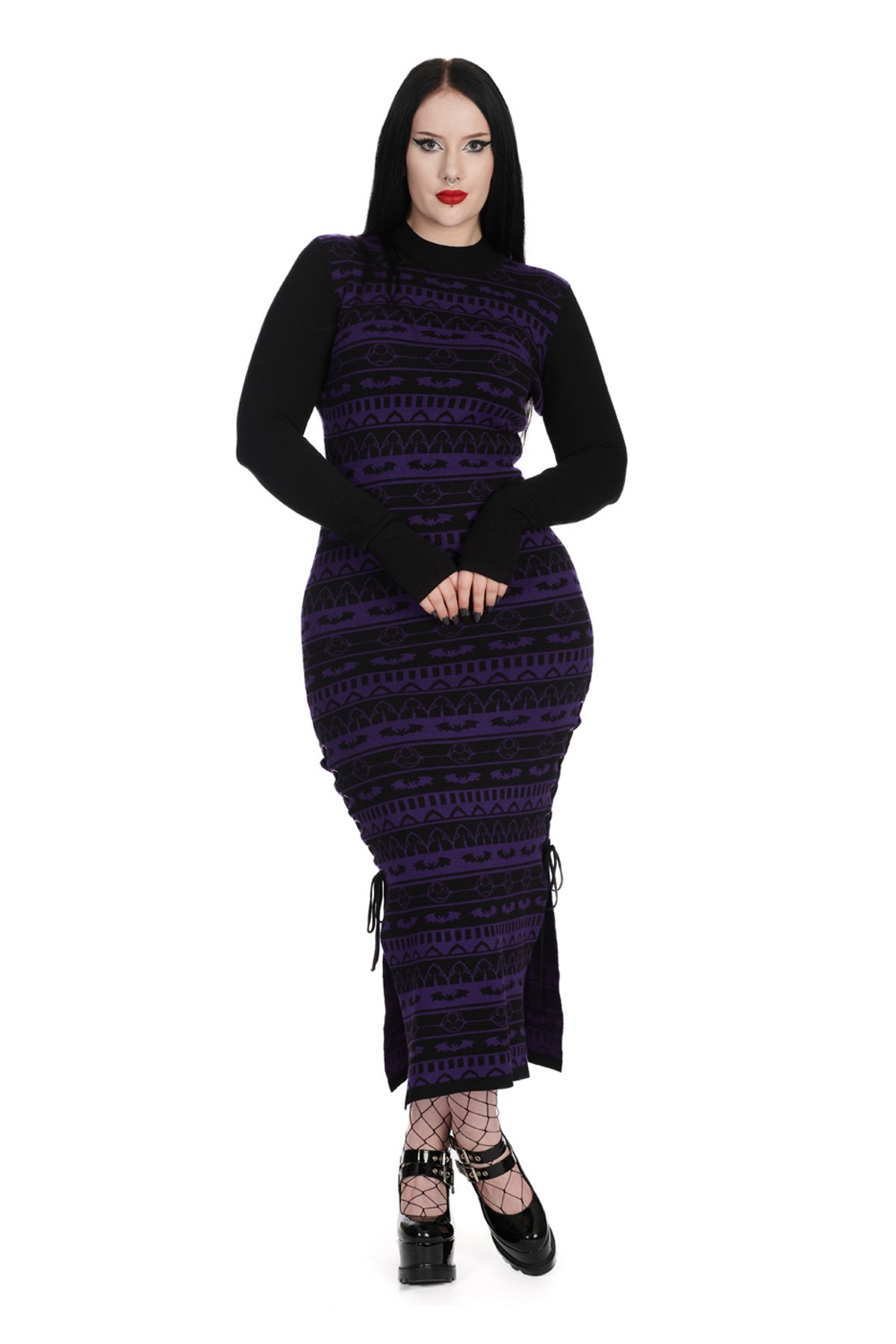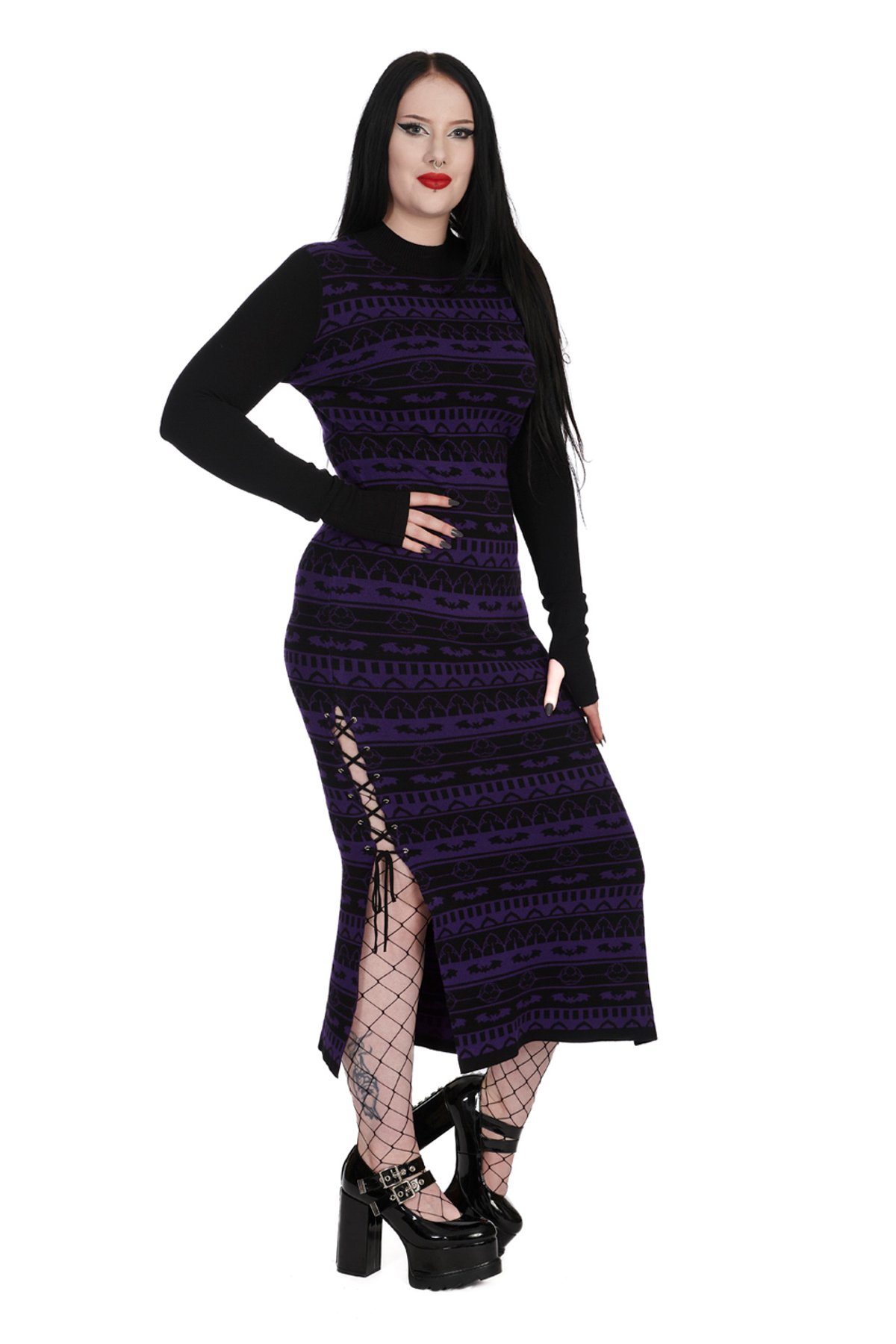 Unleash your inner gothic goddess with this purrfectly fierce Black/Purple BAT BONE DRESS — a silhouette that’s as mysterious as a moonlit night. The rich black and deep purple hues dance together in a geometric and bat motif symphony, turning heads with every step. Crafted from a soft, stretchy knit, this long dress ensures you stay comfortable while looking claws-down gorgeous. The side slits with lace-up details add just the right amount of flirtation, revealing a hint of leg, while the long sleeves with thumb holes keep things sleek and slightly mischievous. Whether you're casting spells or simply strutting through the city, this dress is your darkly enchanting go-to.