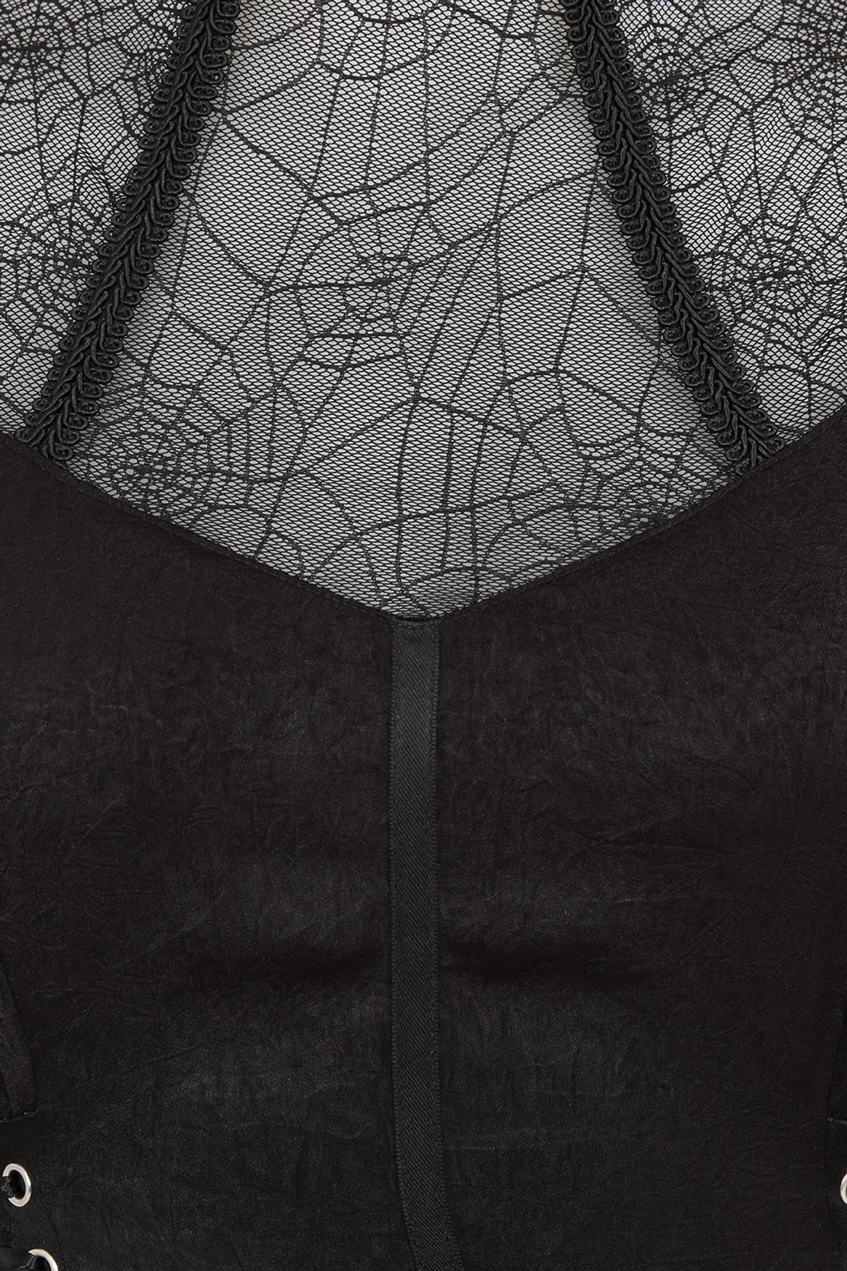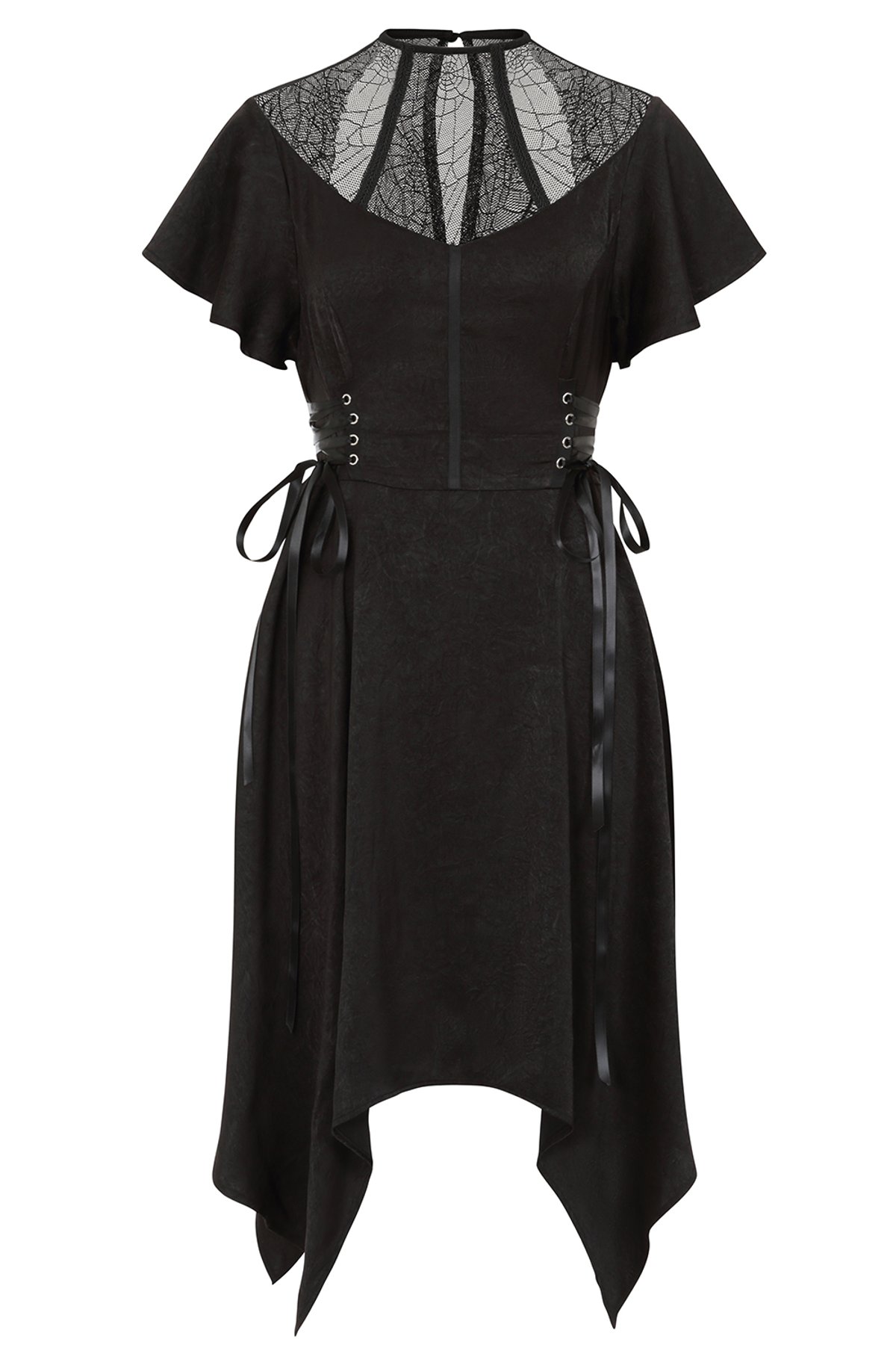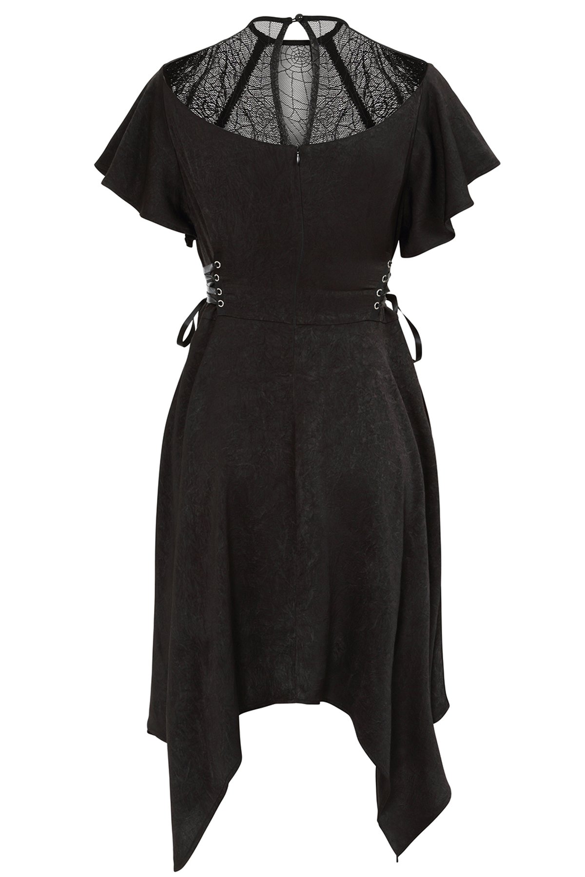 Unleash your inner gothic goddess with the Black ZORA DRESS—a darkly dreamy silhouette that's as mesmerizing as a midnight moon. The delicate spider-web lace detail adds a mysterious allure, while the high neckline and fluttery sleeves strike the perfect balance between sophistication and mischievous charm. The textured matte finish and adjustable corset-style bodice ensure you’ll feel as claw-some as you look, ready to turn heads and ignite whispers of admiration.