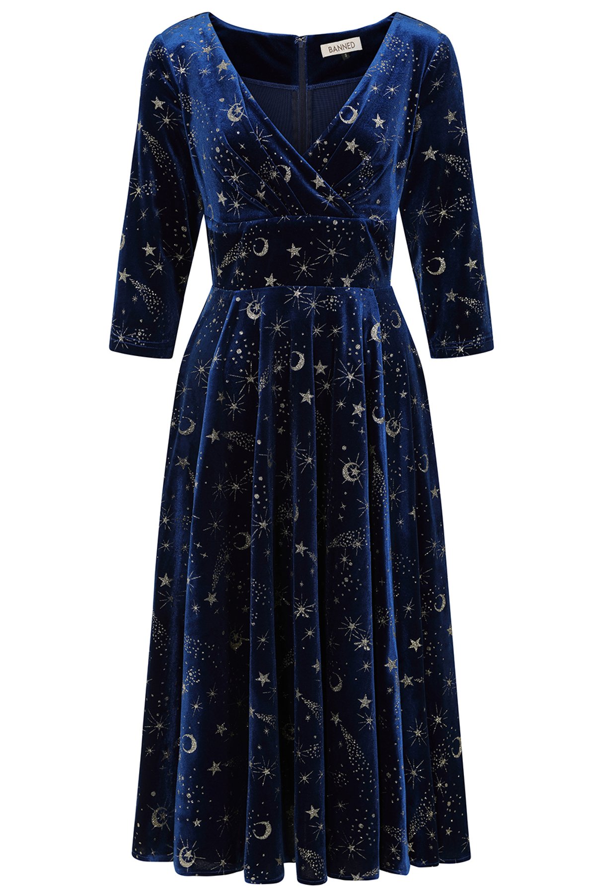 Get ready to turn heads with the Blue Luna Celestial swing dress—where vintage charm meets cosmic sparkle. Its rich blue hue is like capturing the night sky, while the shimmering silver print evokes stardust in full swing. The flattering V-neckline and full, twirl-worthy skirt create that timeless silhouette that’s both playful and refined. Made from a velvet knit blend that hugs you with a gentle stretch, it’s as comfortable as it is captivating. Plus, those handy side pockets add a practical touch to this otherworldly look. Whether you're feeling a little celestial goddess or just love a dash of retro glamour, this dress is sure to make your wardrobe shine brighter than a supernova.