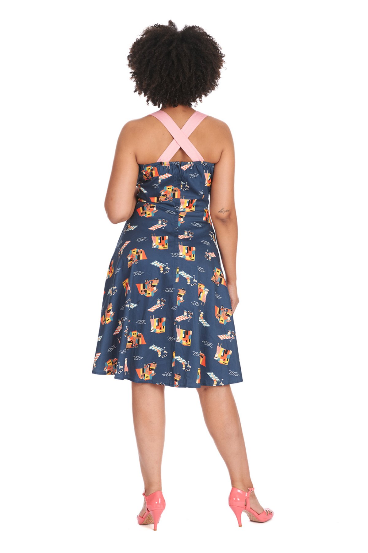 Unleash your inner vintage siren with this Blue PORTOFINO LIVING SWING DRESS — a true showstopper that effortlessly combines playful charm with timeless chic. Its fit-and-flare silhouette and halter neckline flatter every figure, while the abstract pattern in lively blue and pink hues adds a splash of personality. Crafted from a soft, stretchy cotton blend, it moves beautifully with you, making every twirl as enchanting as a moonlit night. Whether you’re feeling flirty or refined, this dress is your purrfect companion for turning heads and paw-sitive compliments.