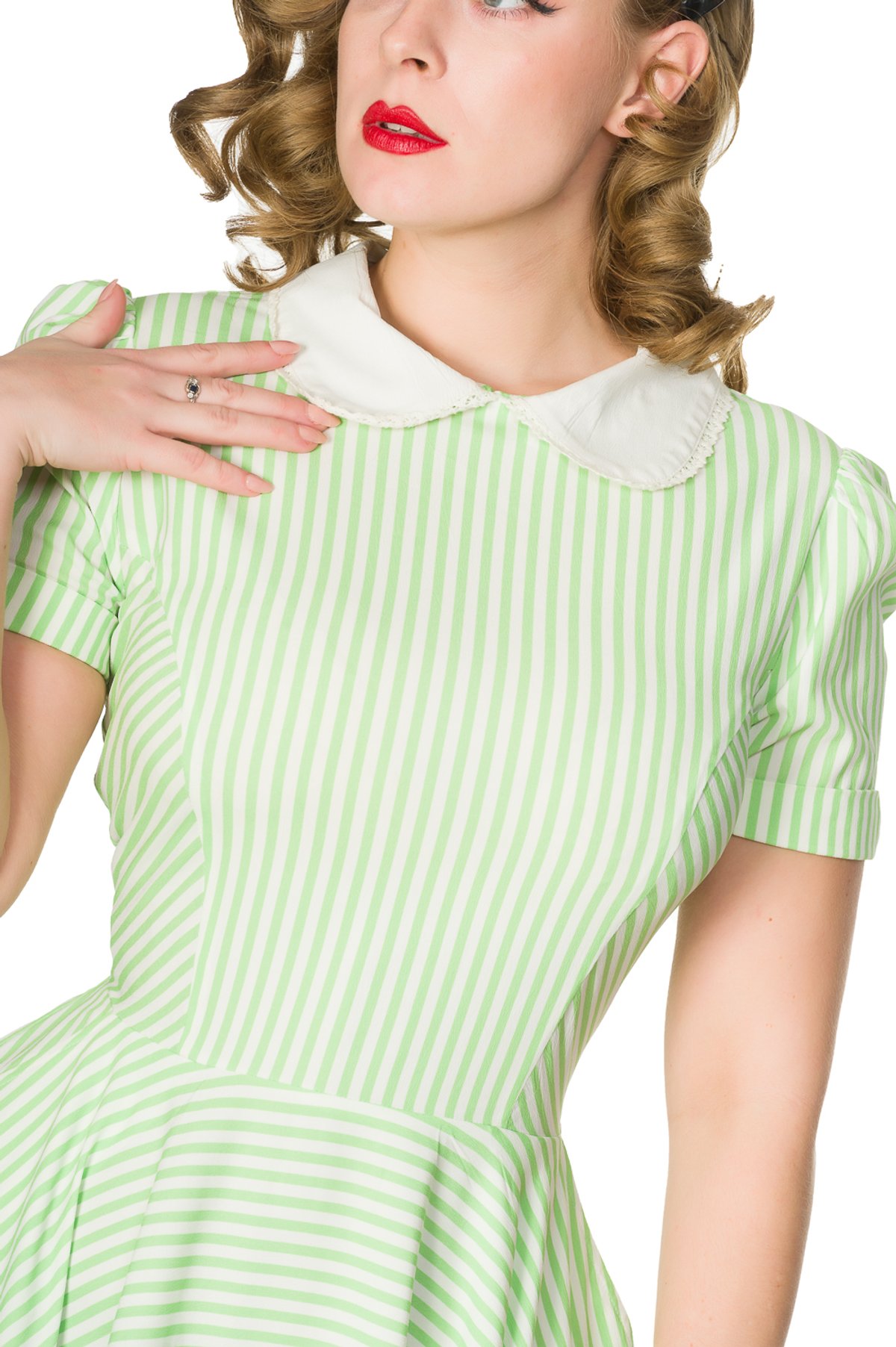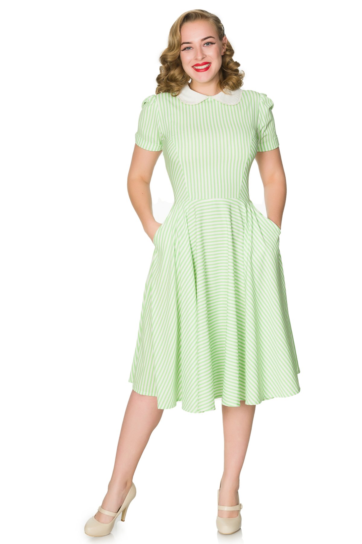 Step into retro chic with the Brielle Dress—a playful yet polished piece that radiates 50s-inspired flair. Its lush green stripes on a crisp white backdrop create a claws-down gorgeous look, while the soft polyester stretch fabric ensures you stay comfortable enough to dance the night away. The sweet Peter Pan collar and modest neckline add just the right touch of innocence, balanced by the flirty swing skirt that promises endless twirling potential. Whether you’re channeling vintage vibes or simply craving a little fun in your wardrobe, this dress is a purrfect choice for making a memorable entrance.
