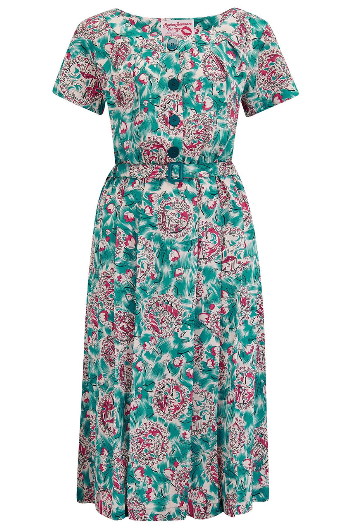💃 Slide into the past with a pinch of modern whimsy in the Brigitte Dress, a charming vintage swing dress. This retro glamour ticket 🎫 features a floral pattern in enchanting shades of teal and pink. The tulip petals-reminiscent overlapping front panels add a 1950s rockabilly 🎸 vibe to your look, whether for a vintage event or a casual day out.