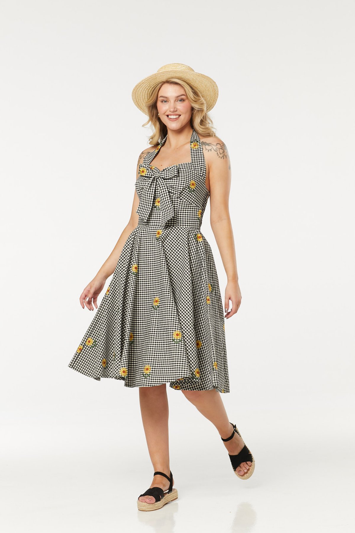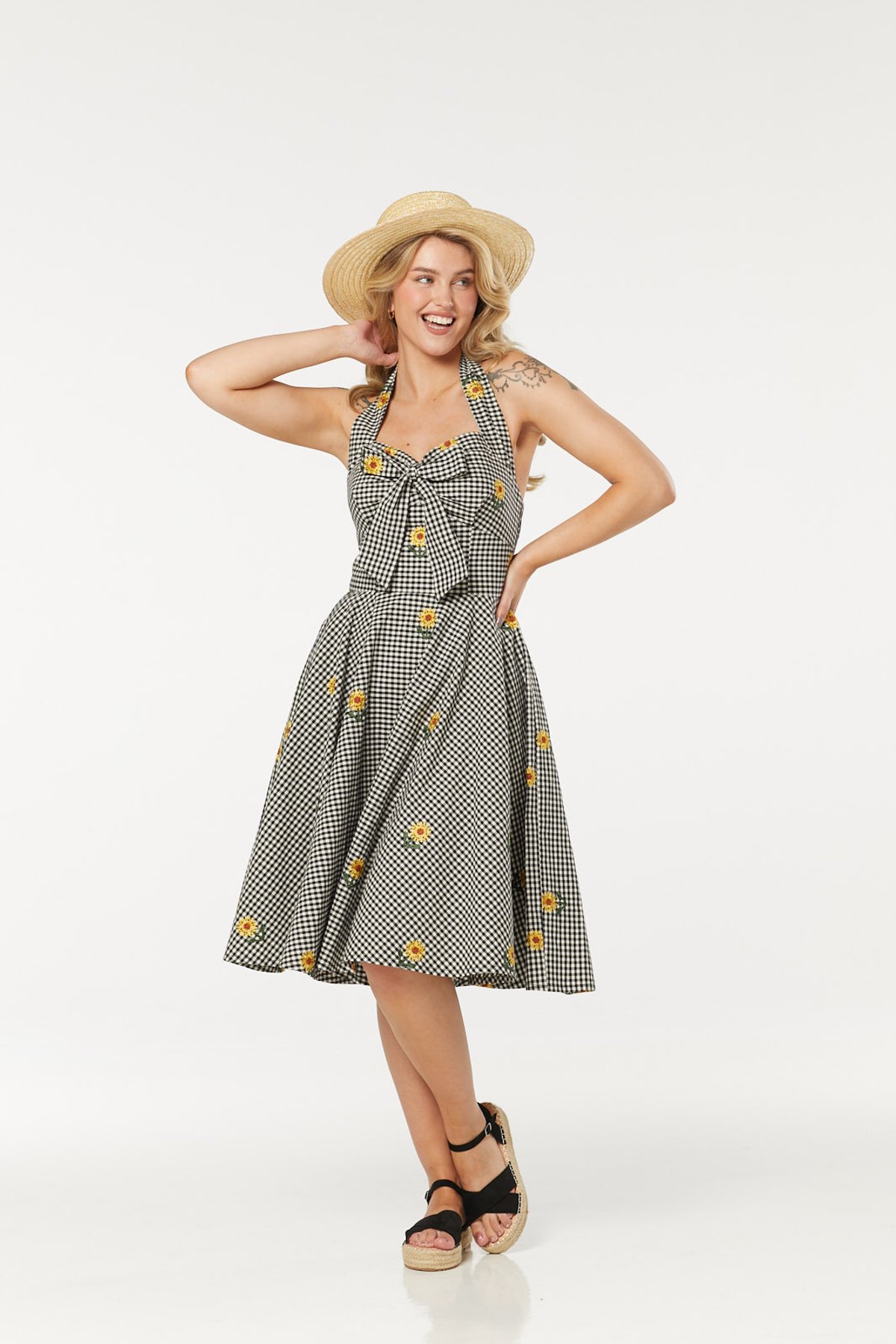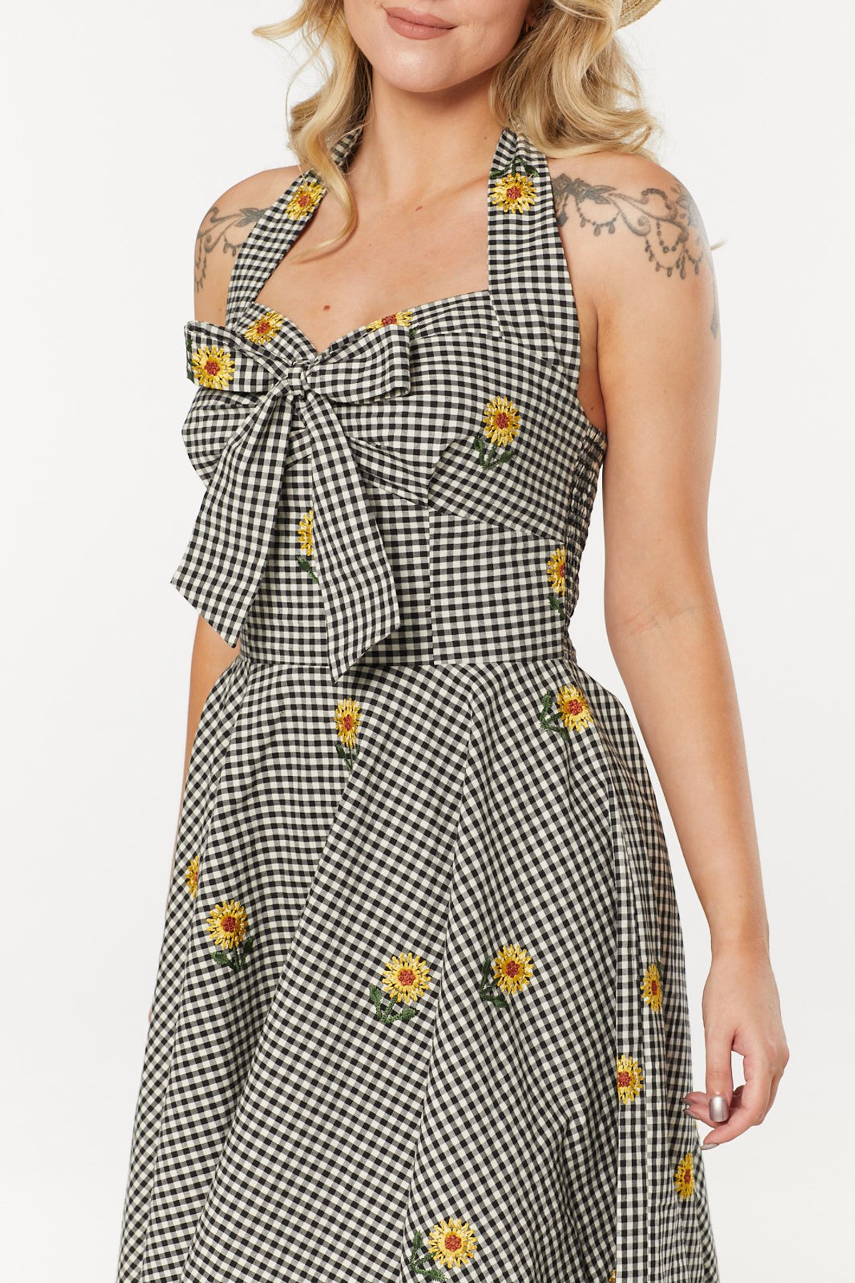 Step into a world where vintage charm and playful sophistication collide with the Camille Dress. From its playful sunflower pattern dancing across the black-and-white gingham to the flattering fit-and-flare silhouette, this piece is a true claws-down gorgeous choice. The halter neck and sweetheart neckline work their magic to highlight your décolletage, while the sweet bow at the bust adds just the right amount of cheeky retro flair. Crafted from organic, breathable cotton, it’s as kind to your skin as it is stylish, making it your go-to for warm days or lively evenings.