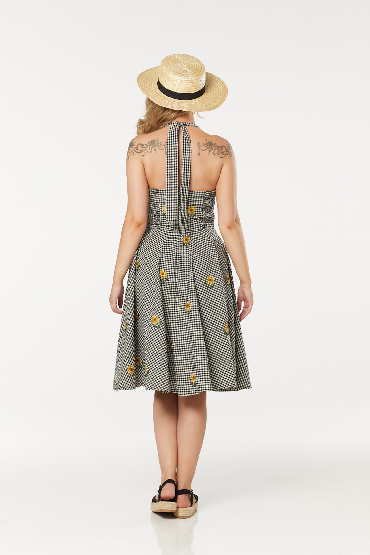 Step into the charm of yesteryears with our 💃 Camille Dress! This delightful vintage gingham swing dress is where nostalgia meets elegance. Its fit-and-flare silhouette, complemented by a playful sunflower pattern 🌻, adds an extra dash of pizzazz to any rockabilly ensemble. The halter neck and sweetheart neckline flatter any figure, while the knee-length swing skirt is perfect for some twirling action.