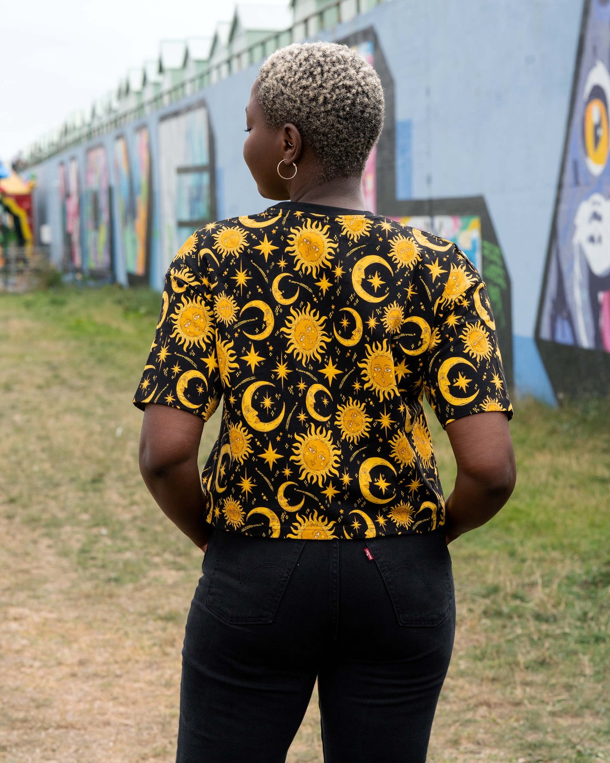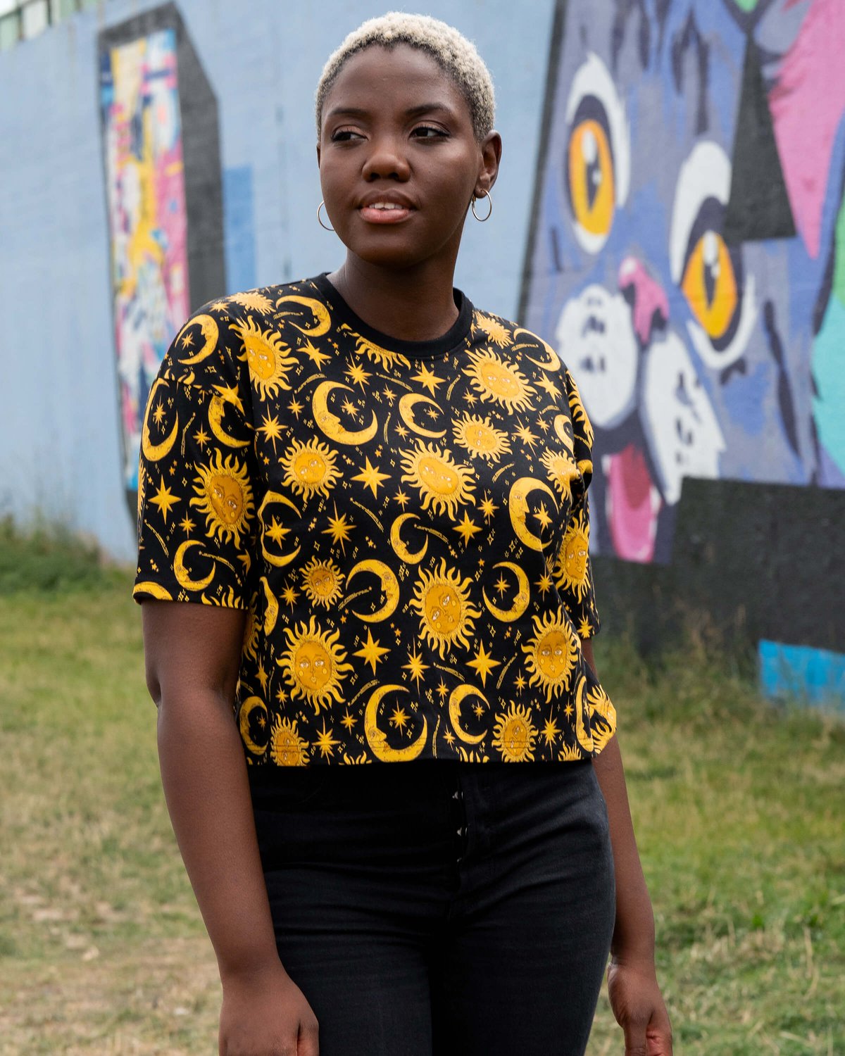 Pair this cosmic crop with high-waisted jeans or a floating skirt to elevate your look, and add a splash of gold jewelry to match the sun-kissed hues. For men or unisex styling, consider layered chains or a cool cap to keep things fresh and effortlessly chic. Keep your accessories playful but polished—we’re here for a look that’s the paw-sitive mix of mischievous and magnificent.