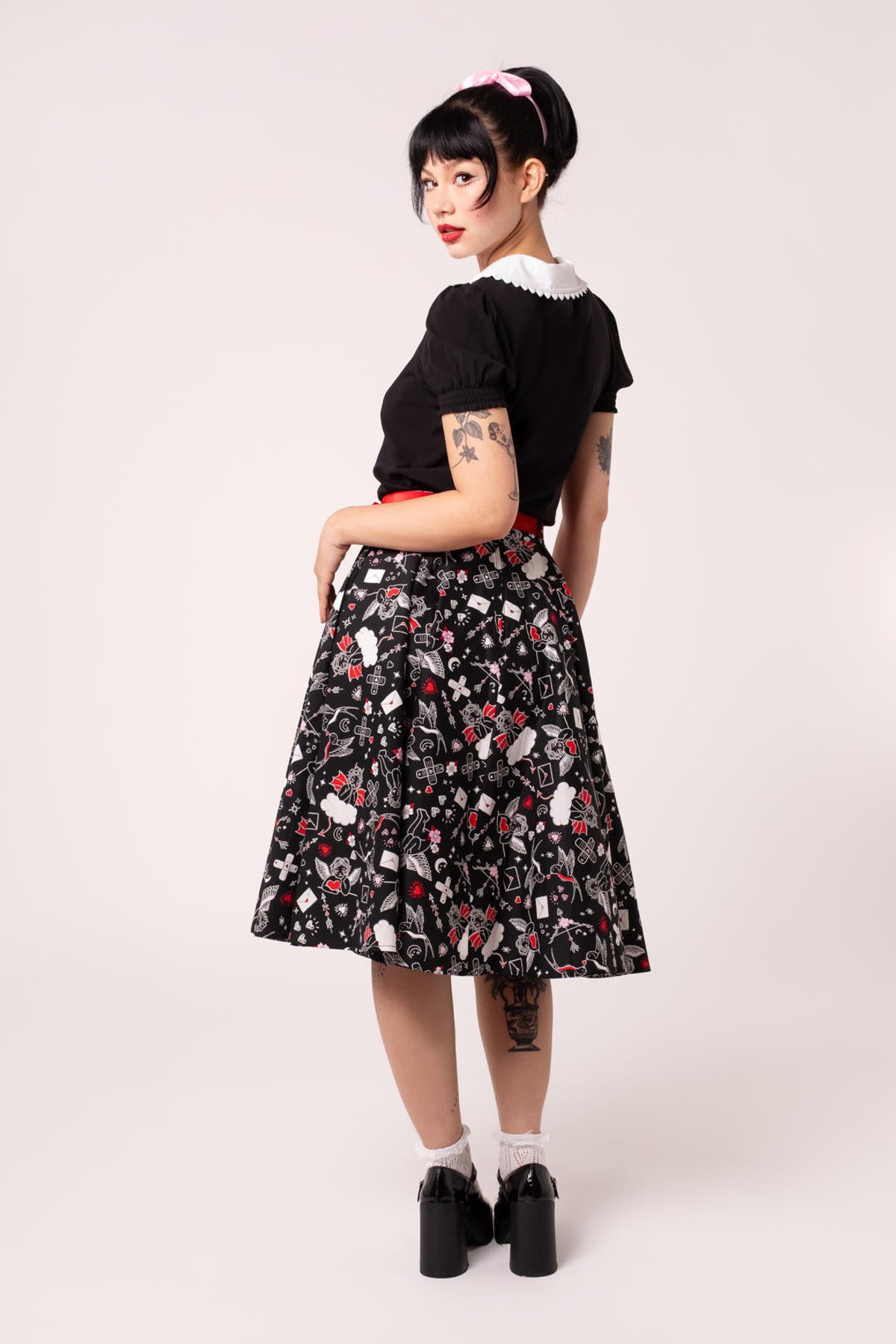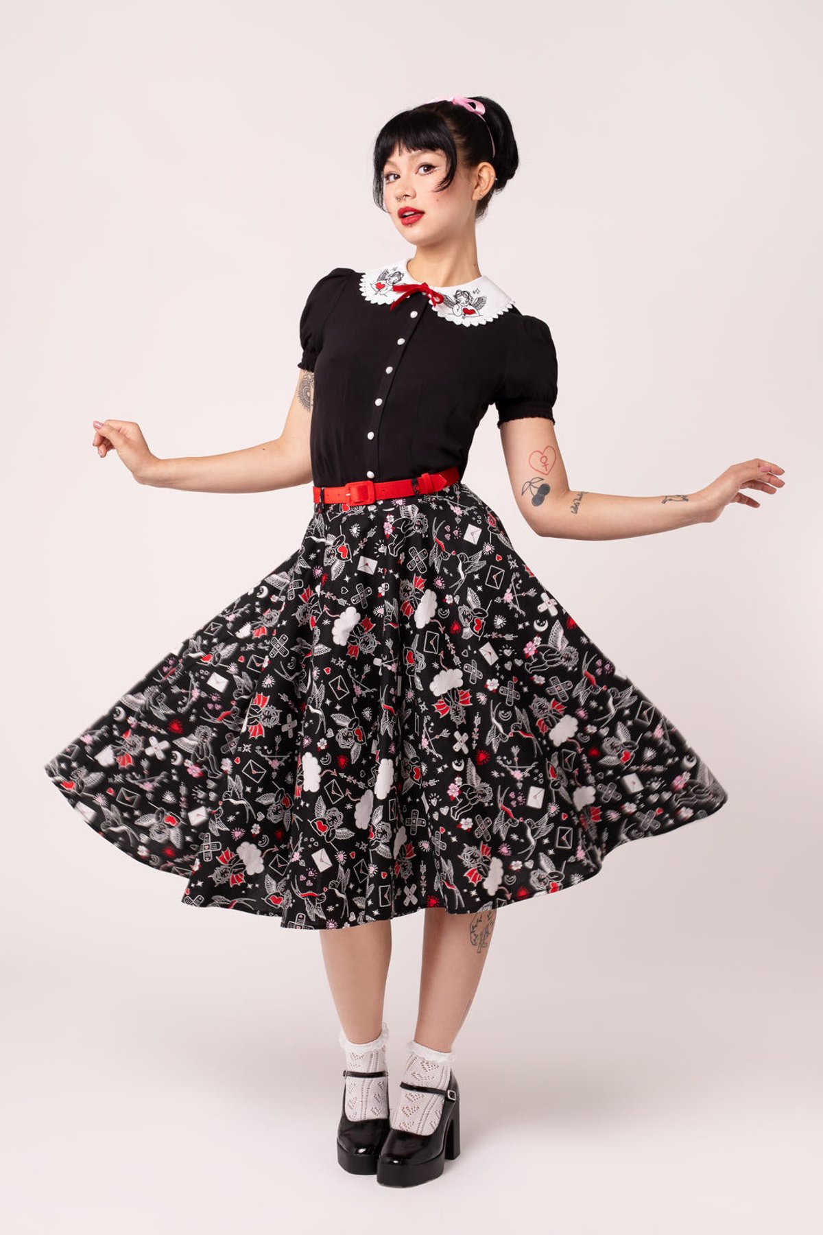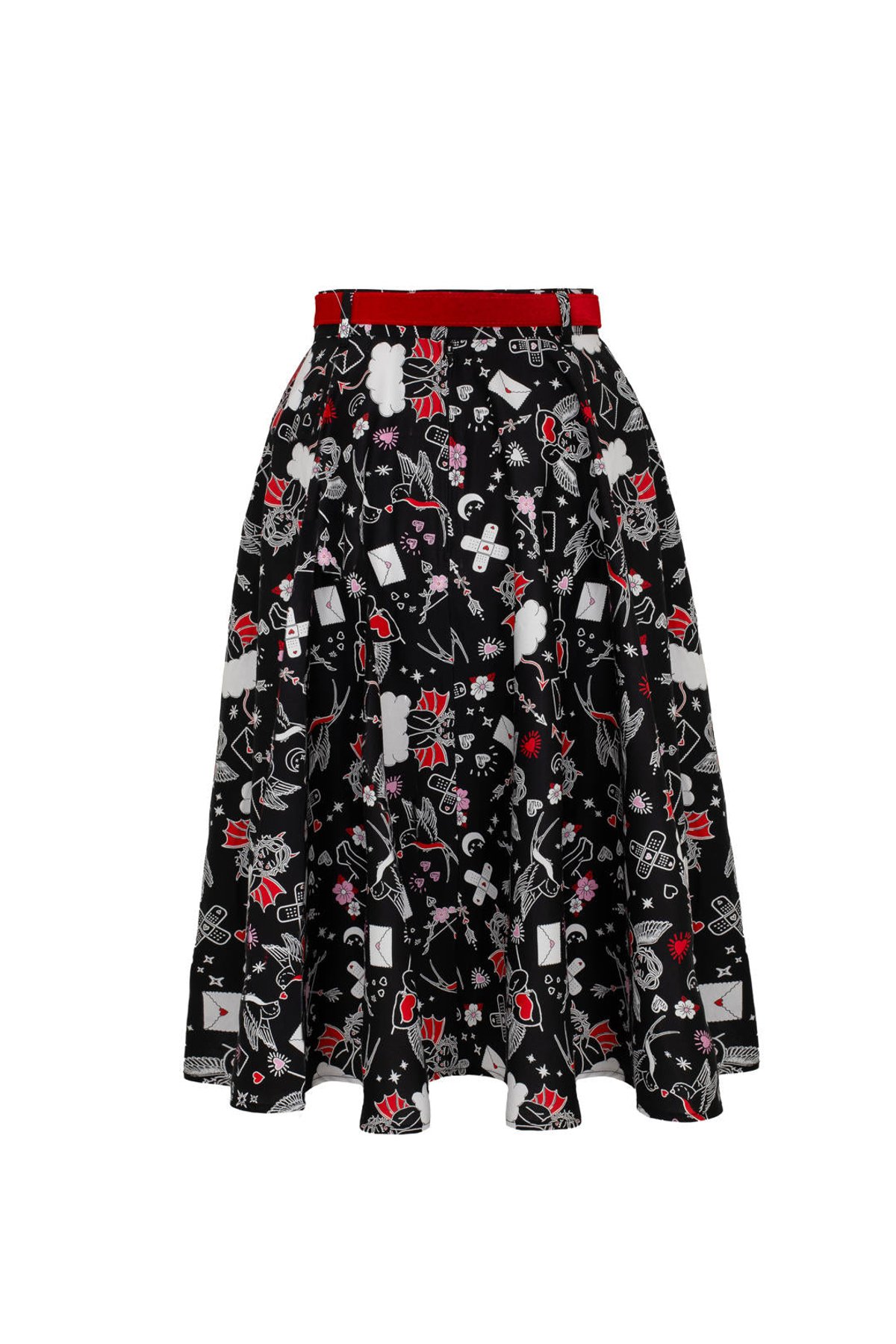 Unleash your inner vintage vixen with the Charlie Skirt—where retro charm meets playful panache. The eye-catching novelty print of cherubs, hearts, swallows, and blooms dances across the sleek black fabric, accented by vibrant red details and a matching belt that’s just as mischievous as you are. The full circle silhouette invites you to twirl with abandon, while the side seam pockets keep your essentials close at paw. Crafted from a comfy, stretchy cotton blend, this piece promises both style and ease, making it purrfect for days when you want to feel fabulous without fuss.