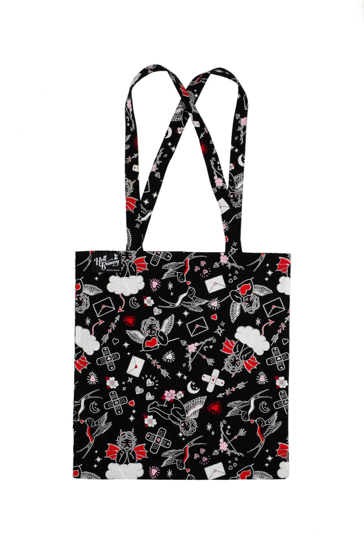 Fall head over heels with our Charlie Tote Bag 🖤 A gorgeous blend of vintage romance and streetwear chic, this bag is an undeniable style statement. Decorated with an array of tattoo-inspired graphics including cherubs, hearts, swallows, and flowers, this bag adds a dose of drama to your everyday look.
