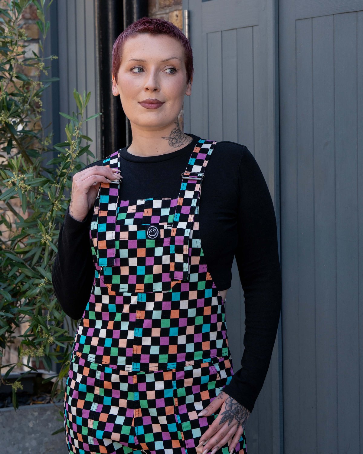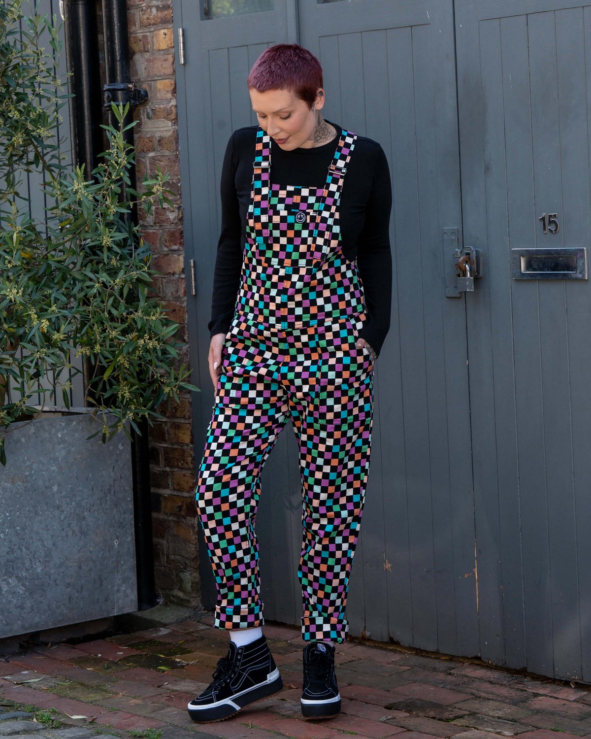 Step into playful sophistication with our Checkerboard Stretch Dungarees—where a bold black background meets lively pastel checkerboard blocks for a look that’s both retro-chic and effortlessly modern. Crafted from comfy stretch twill, they move with you, keeping you stylish and easygoing all day long. The relaxed fit, adjustable buckle straps, and handy turn-ups make these dungarees as practical as they are eye-catching. Whether you're making a statement at brunch or just embracing your cool, casual side, these are the perfect canvas for your standout style.