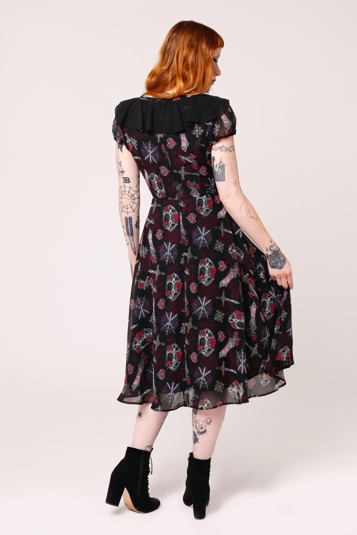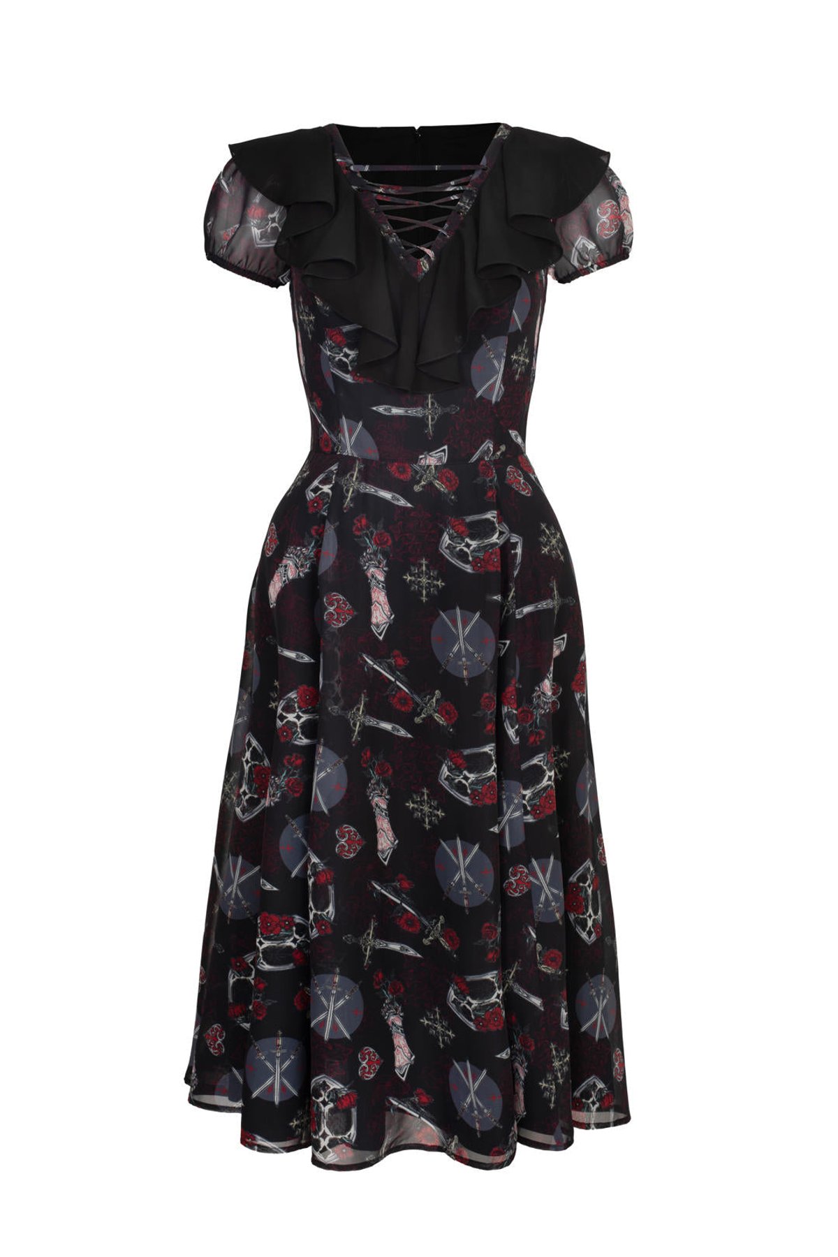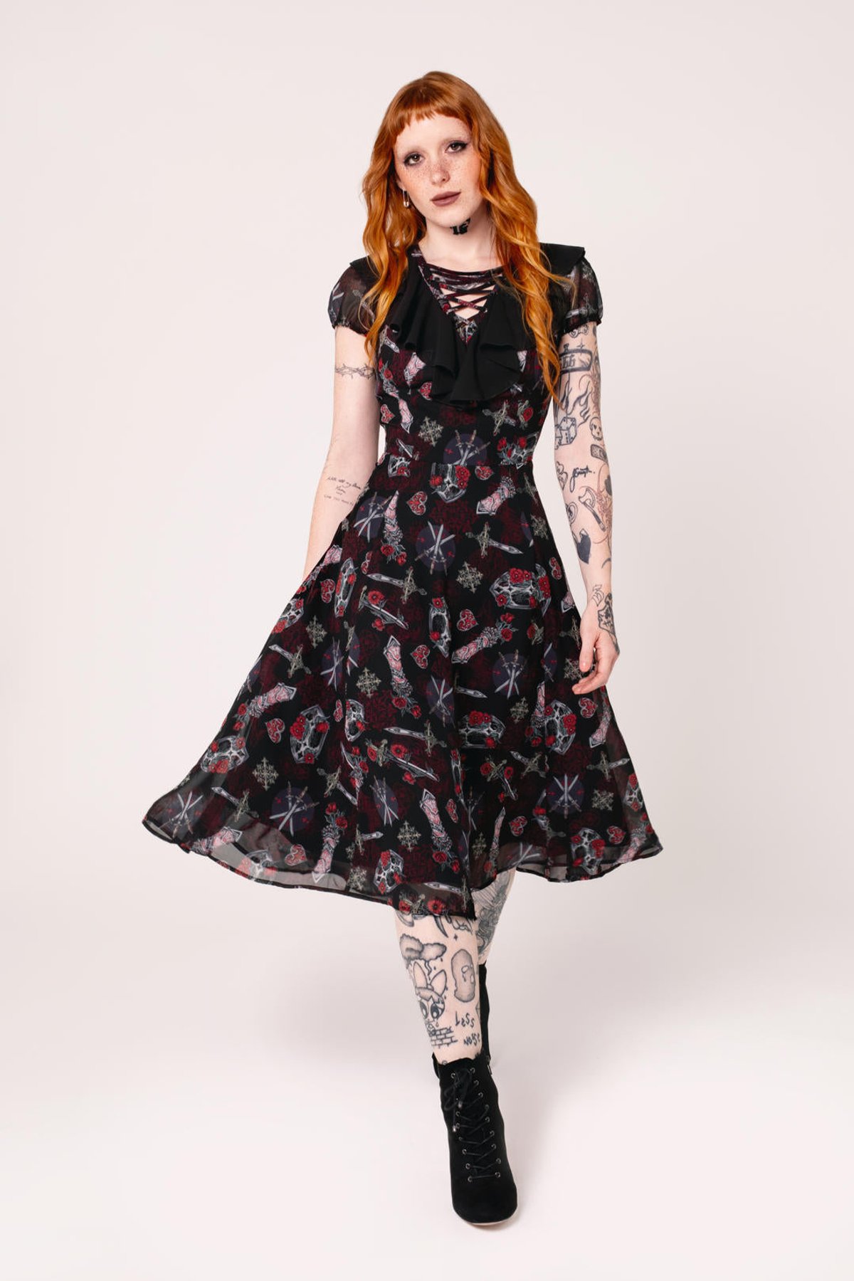 Step into the spotlight with the Clarimond Dress — a spellbinding blend of gothic allure and playful charm. Its striking black fabric is adorned with intricate floral and graphic motifs, giving it a mysterious yet captivating vibe. The lace-up neckline, framed with delicate black frills, hints at medieval elegance, while the puff sleeves add a flirtatious, feminine twist. With its flattering silhouette and dramatic length, this dress is a purrfect choice for those who love to make a bold statement with a touch of dark romance.