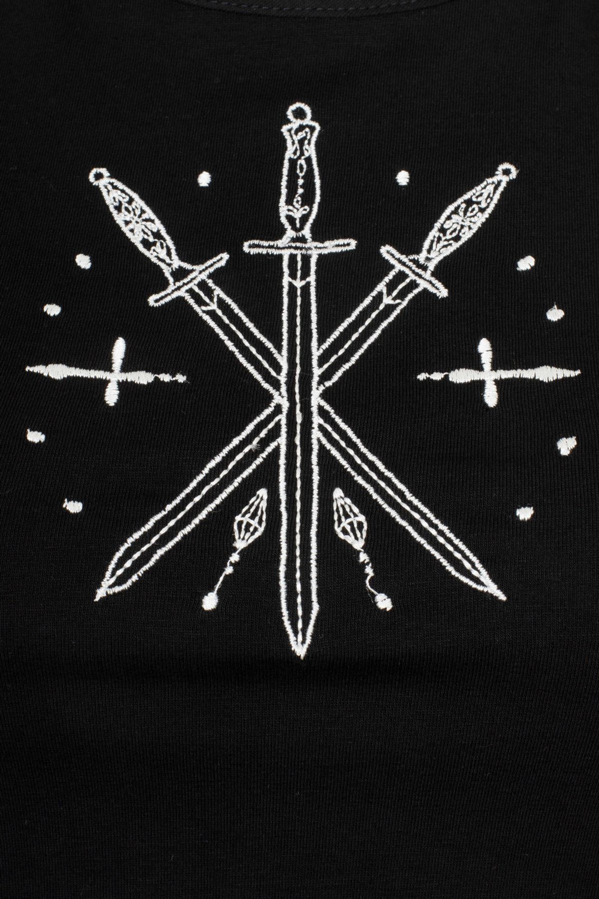 Elevate your style with our captivating Clarimond Top 🖤. This gothic-style gem merges medieval mystique with a modern edge, becoming an irresistible wardrobe essential. Serving drama with its dramatic graphic of white-embroidered medieval swords on a snug, black jersey crop top, it’s the perfect piece to unleash your inner gothic goddess.