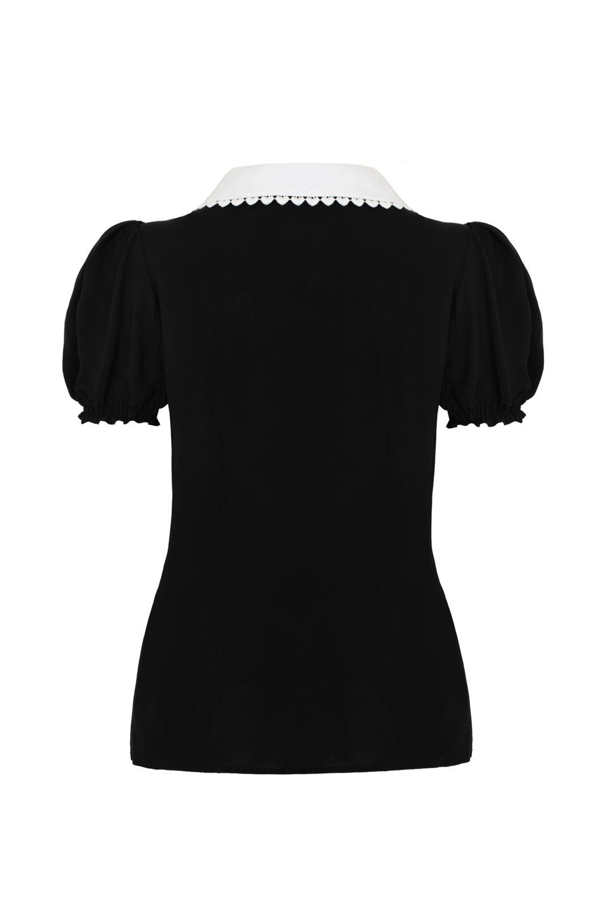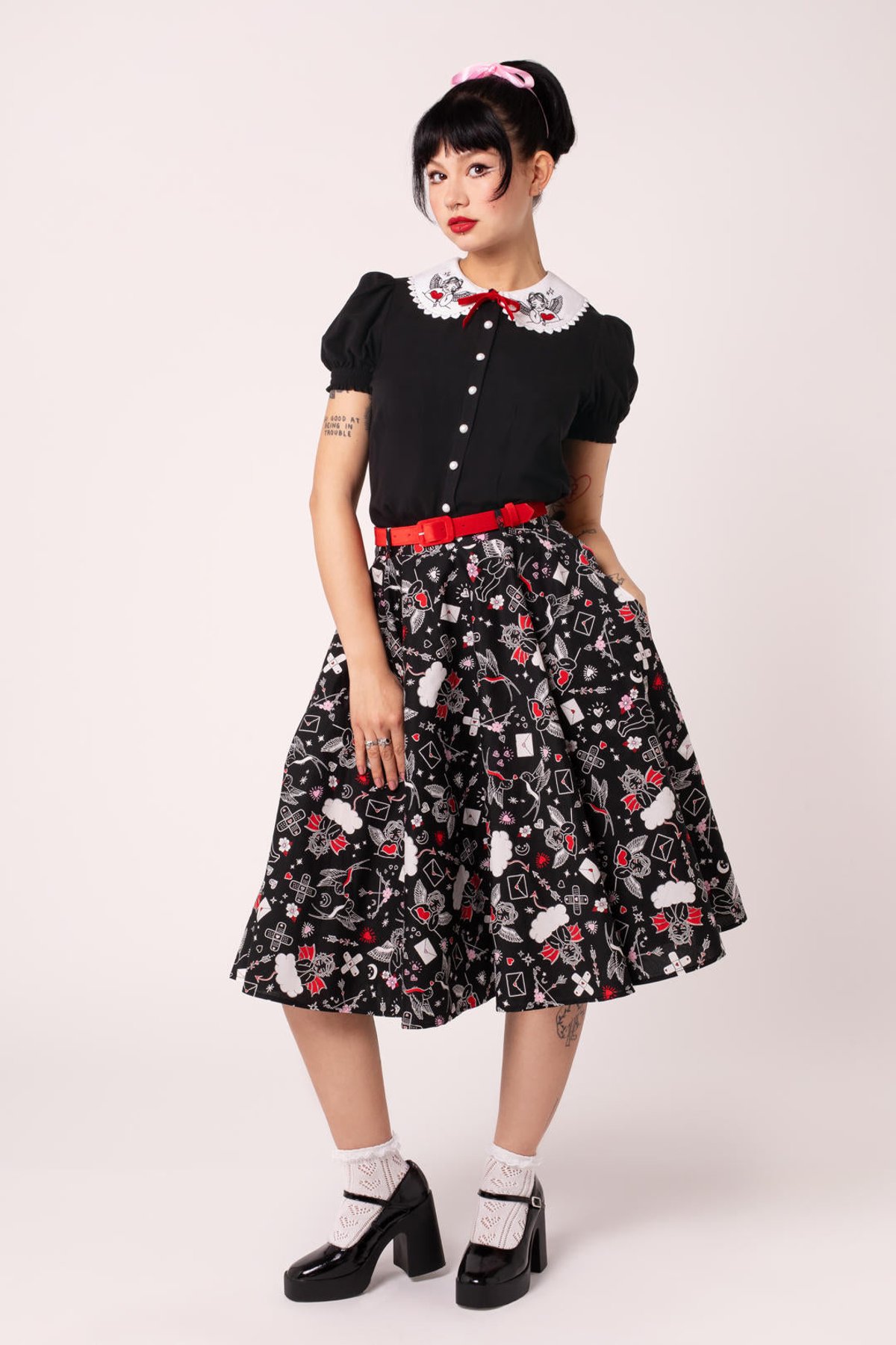 Get ready to fall head over paws for the Cupid Blouse—a true purrfection in vintage-inspired chic. With its playful heart lace trim, whimsical cherub embroidery, and a charming red velvet bow that’s just begging to be noticed, this semi-fitted beauty is a masterclass in modern nostalgia. The classic black and white palette makes it a versatile staple, while the delicate puff sleeves and flattering cut ensure you'll feel as fabulous as you look.