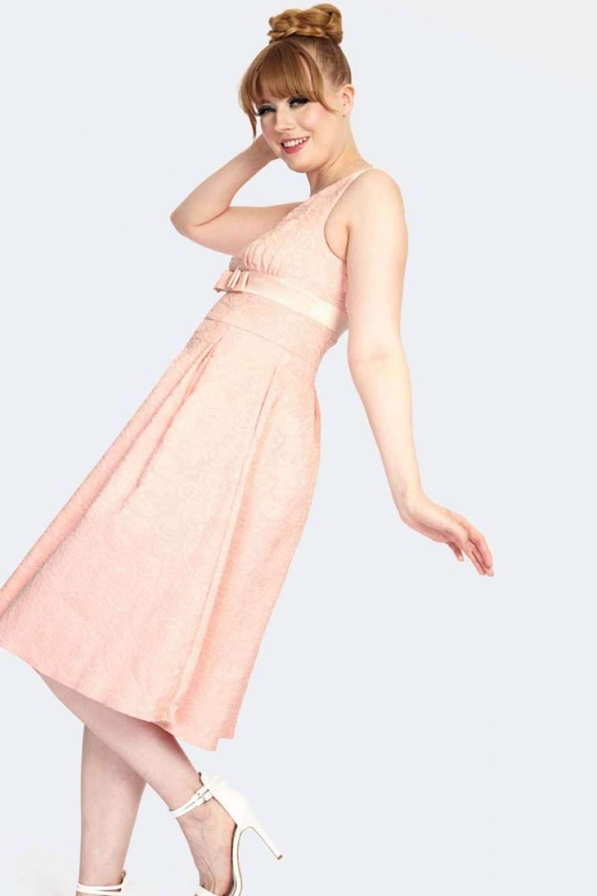 Step into a world of timeless charm with our Curve Floral Lace Flare Dress, a perfect blend of vintage allure and modern sophistication. The delicate floral lace whispers romance, while the soft peach hue adds a playful, yet polished touch. Designed to hug your curves and sway with every move, this dress is a delightful encore to your wardrobe, making you look pawsitively stunning from every angle. Its flared silhouette invites a twirl or two, capturing that effortless, catwalk-ready vibe without a hint of fuss.
