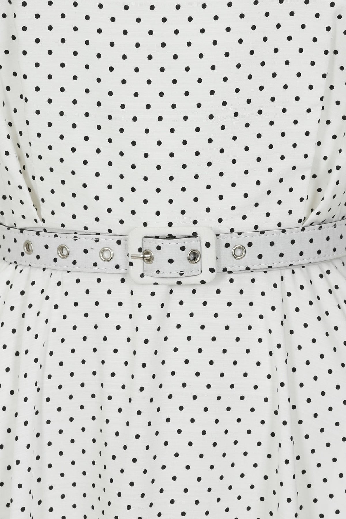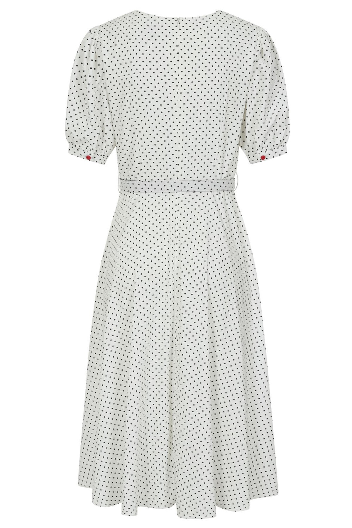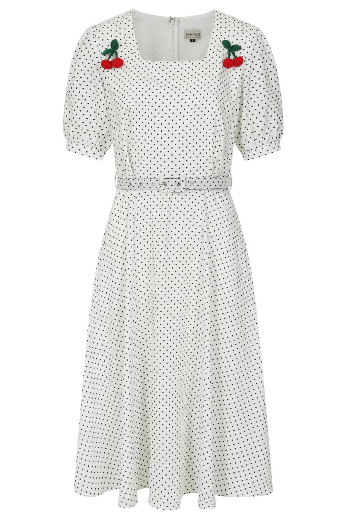 WOVEN COTTON SPOT FIT AND FLARE DRESS WITH SQUARE NECKLINE, SIDE SEAM POCKETS, REMOVABLE CHERRY BOW TRIM AND BELT IN SELF.