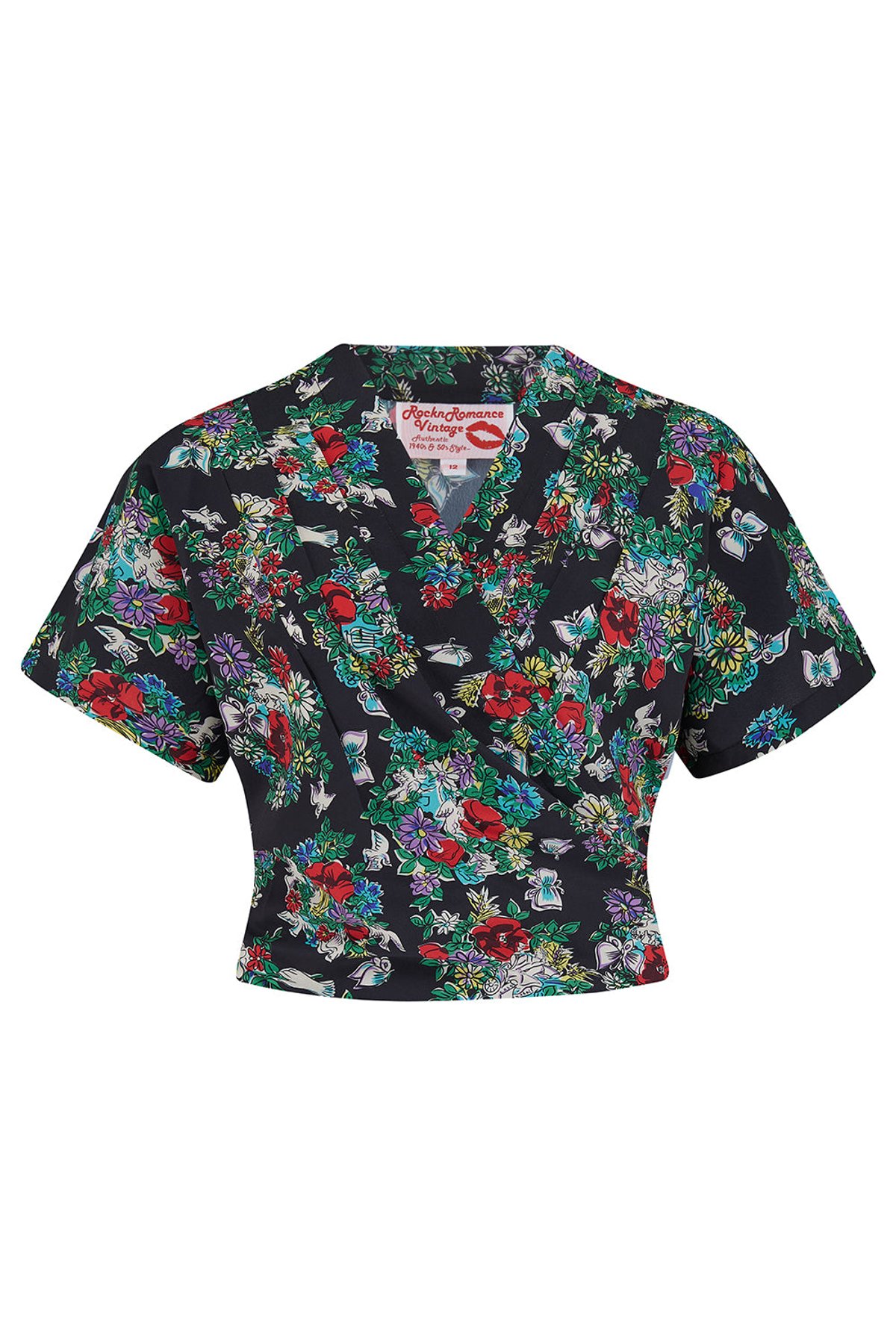 Unleash your inner vintage vixen with the Darla Short Sleeve Wrap Blouse in Secret Garden Print—a purrfect blend of timeless charm and modern flair. This blouse features a delightful floral pattern set against a sleek black background, making it a versatile piece that exudes effortless elegance. The wrap design offers a customizable fit, while the front pleats flatter and enhance every silhouette. Crafted from plush poly crepe, it drapes beautifully and feels as fabulous as it looks—no fuss, just pure vintage allure.