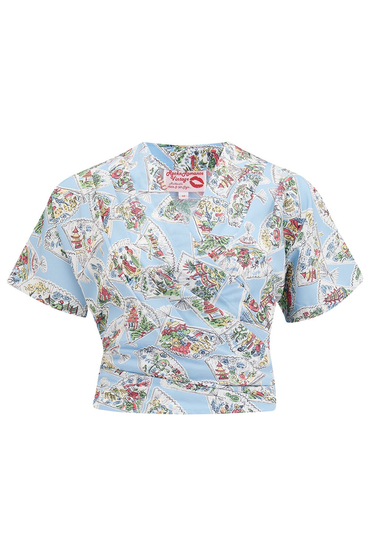 Unleash your inner vintage vixen with the Darla Short Sleeve Wrap Blouse, a true glamour gem in a dreamy pagoda print that’s just purrfect for adding a splash of retro elegance to any wardrobe. Its light blue hue and soft poly crepe fabric drape with a timeless grace, while the full wrap design ensures a fit that’s as flexible as a feline’s agility. Whether worn tucked into a high-waisted skirt or paired casually with jeans, this blouse embodies that irresistible blend of chic and playful that’s impossible to ignore.